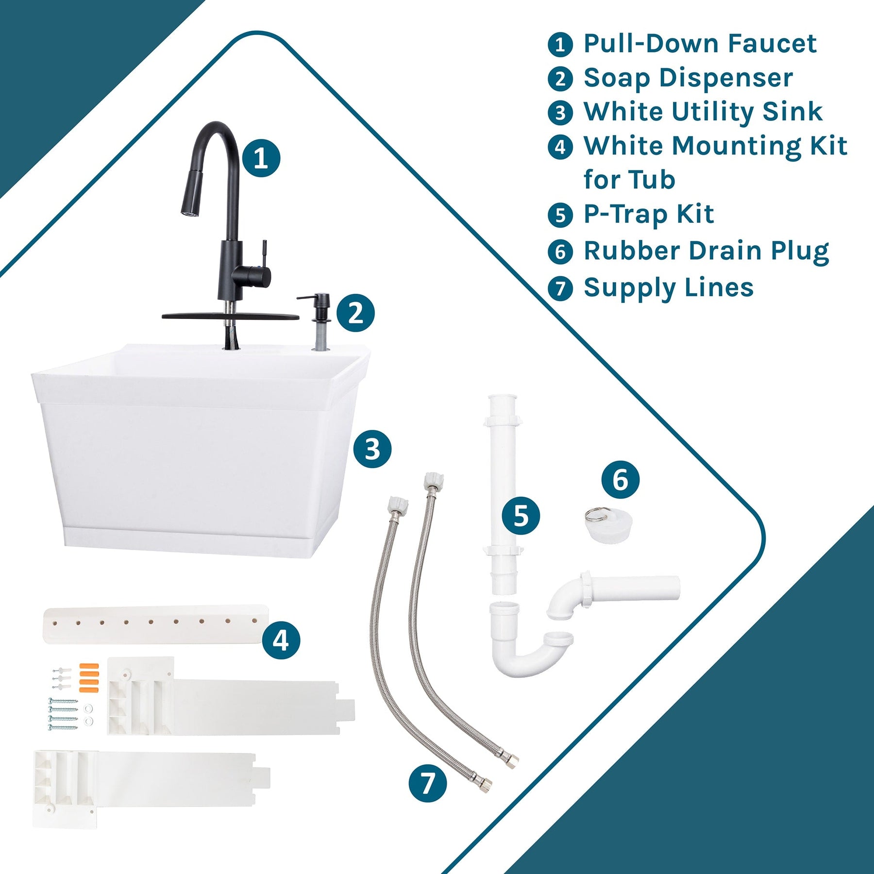 - Complete Utility Kit: Includes tub, high arc faucet, soap dispenser, and all necessary mounting hardware.