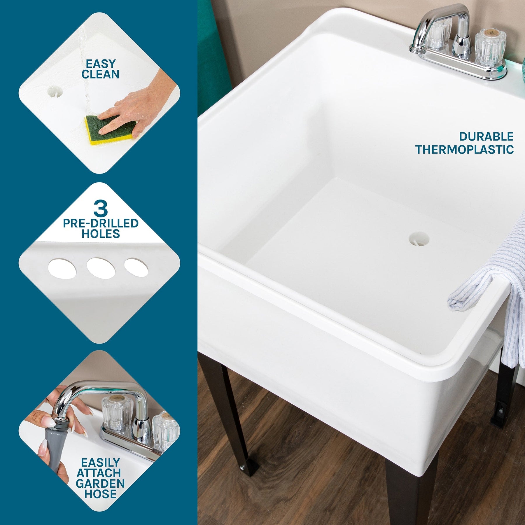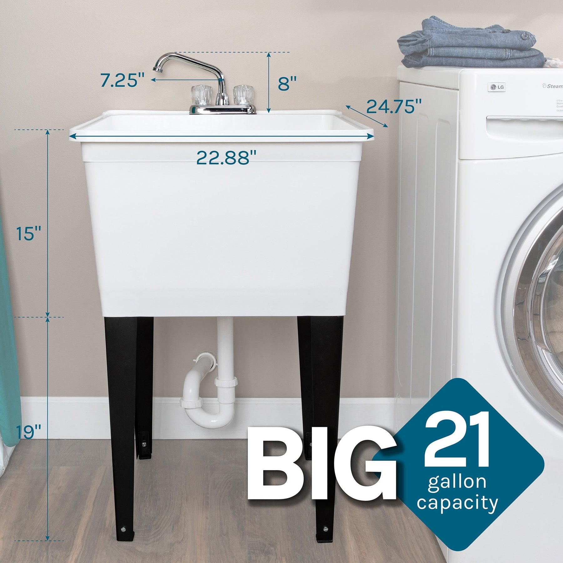 Streamline your utility tasks with the Cambridge Resources Freestanding Utility Tub. This durable 21-gallon capacity tub is designed with a sleek white finish and comes complete with a nonmetallic faucet, making it the perfect addition to any basement or laundry room. Equipped with steel legs and adjustable levelers, it offers stability and easy installation on any floor surface.