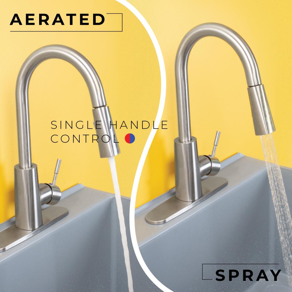 Versatile Faucet: Features a 16-inch high-arc pull-down faucet with dual spray and stream functions for versatile use.