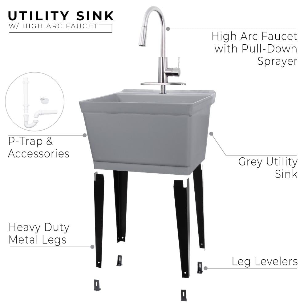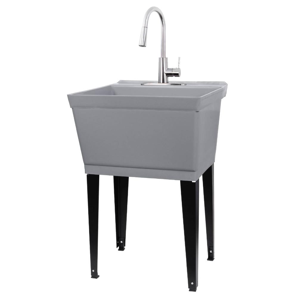 The Cambridge Resources Freestanding Utility Tub offers unmatched durability with its robust thermoplastic construction that resists cracking, leaking, and mildew. Pairing functionality with style, this tub is fitted with a 16-inch high-arc pull-down faucet, perfect for managing bulky cleaning tasks. Designed to streamline any laundry or utility room with its sleek gray finish and sturdy build.