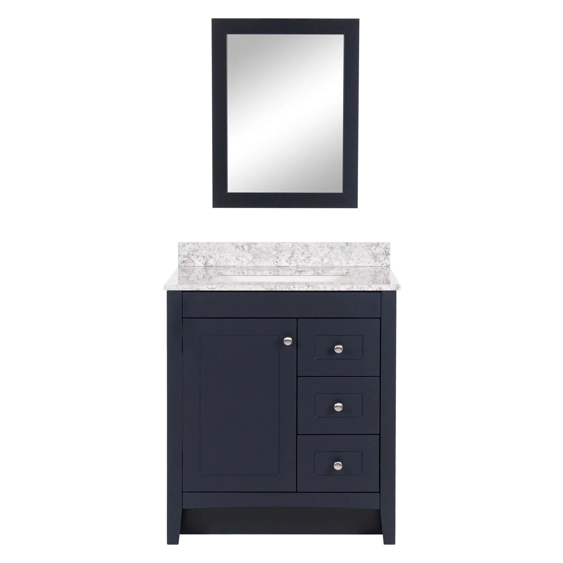 A stylish 31-inch bathroom vanity in deep blue, paired with a matching framed mirror. Features a single undermount sink, brushed silver hardware, and practical storage with a door and drawers for everyday essentials.