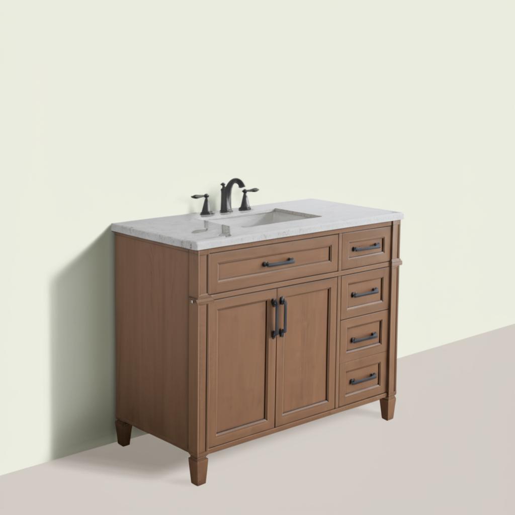 The Caville 42-inch Bath Vanity combines traditional elegance with modern functionality. Featuring a Carrara marble countertop, ample storage, and soft-close mechanisms, this vanity is perfect for enhancing any bathroom space.
