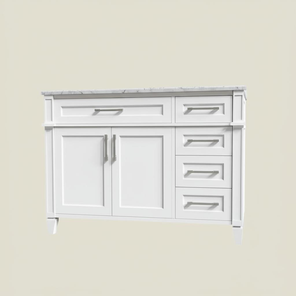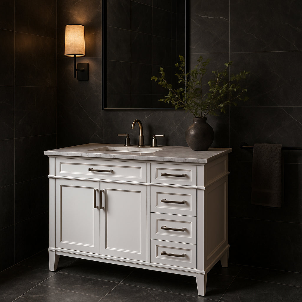 Transform your bathroom into a sanctuary of elegance with the Caville 42-inch vanity. Its Carrara marble countertop exudes timeless sophistication, while the soft-close drawers and concealed hinges add a touch of modern functionality. Pair it with brushed nickel hardware for a cohesive look, or opt for black accents to create a striking contrast. This vanity is not just a piece of furniture; it's a statement of refined taste and luxurious living.