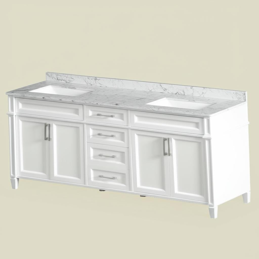 The Caville 72-inch Double Sink Vanity combines traditional elegance with modern functionality. Featuring a Carrara marble countertop, ample storage, and integrated electrical outlets, this vanity is perfect for enhancing your bathroom's style and convenience.