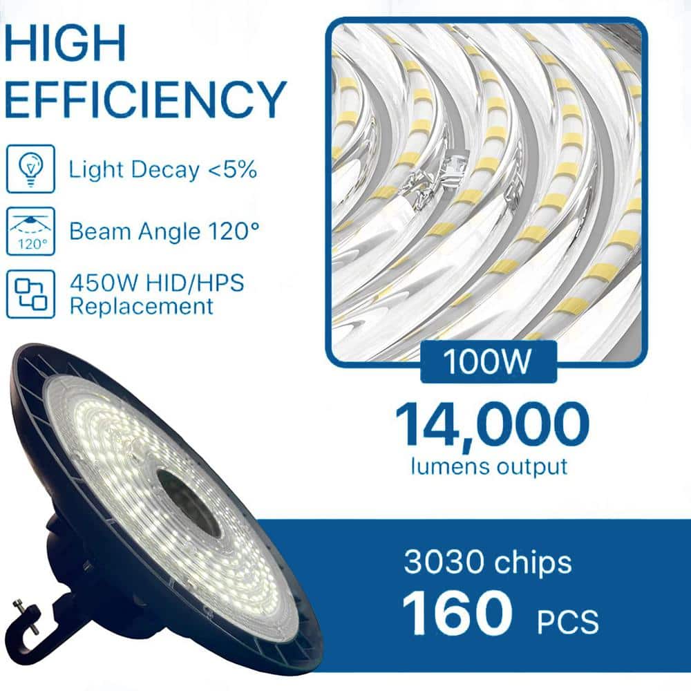 - Power Efficient: Consumes only 100 watts while delivering 13,000 lumens, equivalent to a 300-watt traditional fixture.