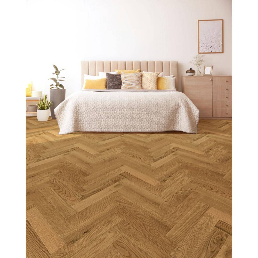 Elevate your interior with the timeless elegance of herringbone-patterned Honey Oak floors. Imagine the rich, golden hues as they dance with sunlight, bringing warmth and sophistication into any room. The smooth, prefinished surface gleams subtly, harmonizing with both contemporary and classic design schemes. Style it with plush, neutral-toned rugs and accent with textured throws to create a harmonious balance. Truly, these floors are a testament to luxurious living where every moment is treasured.