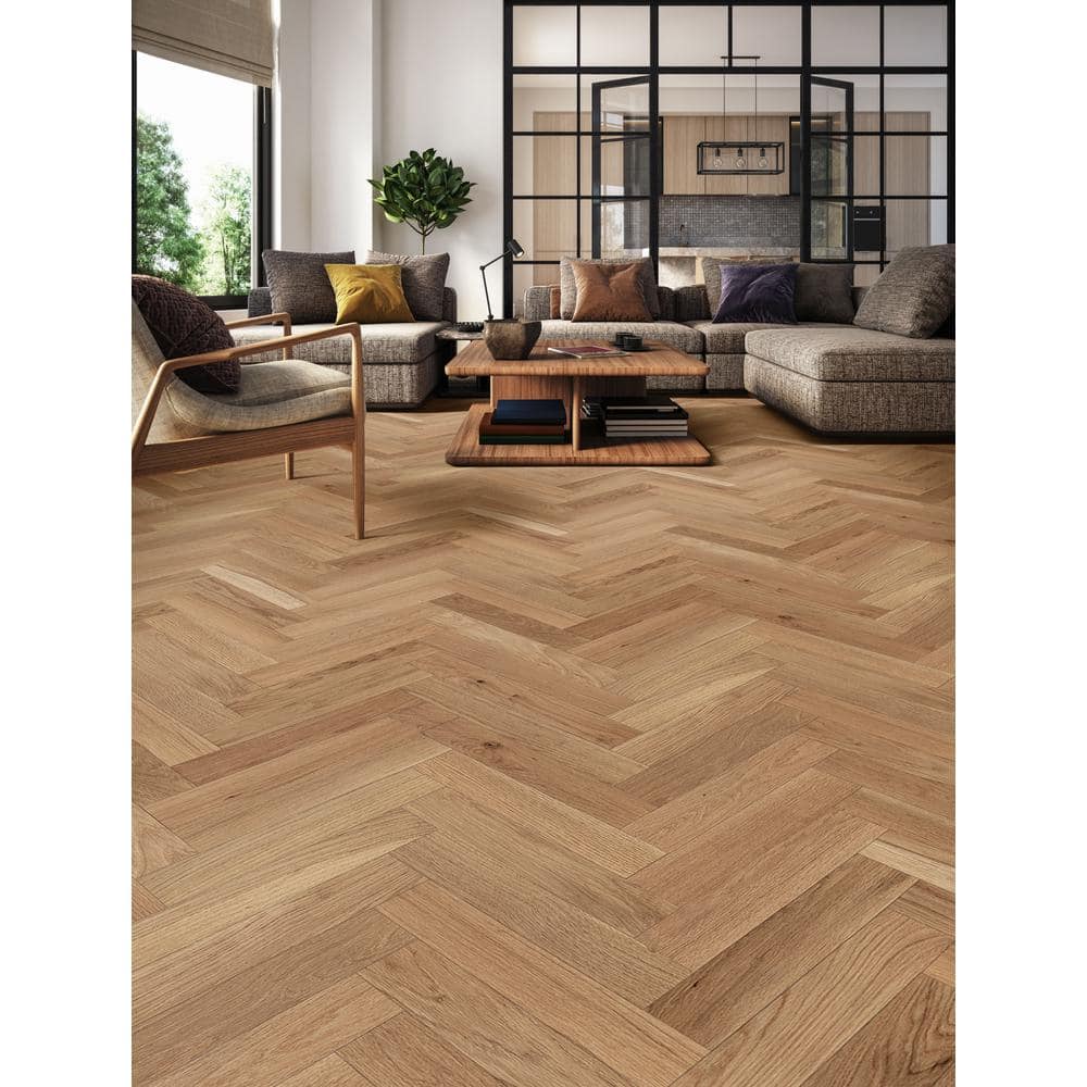 Enhance your home with the timeless elegance of CENTURY FLOORING's Natural White Oak Solid Herringbone Hardwood. This 3/4 in. thick, prefinished flooring combines classic beauty with modern durability, making it perfect for any living space. Proudly made in the USA, it features a 50-year residential finish warranty, ensuring long-lasting quality and appeal.