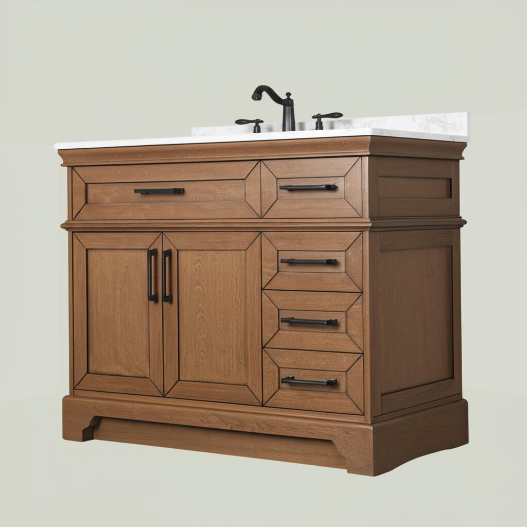 The Cherrydale Vanity combines rustic charm with modern functionality, featuring a durable engineered marble countertop, ample storage, and a soft-close mechanism. Perfect for enhancing any bathroom space.