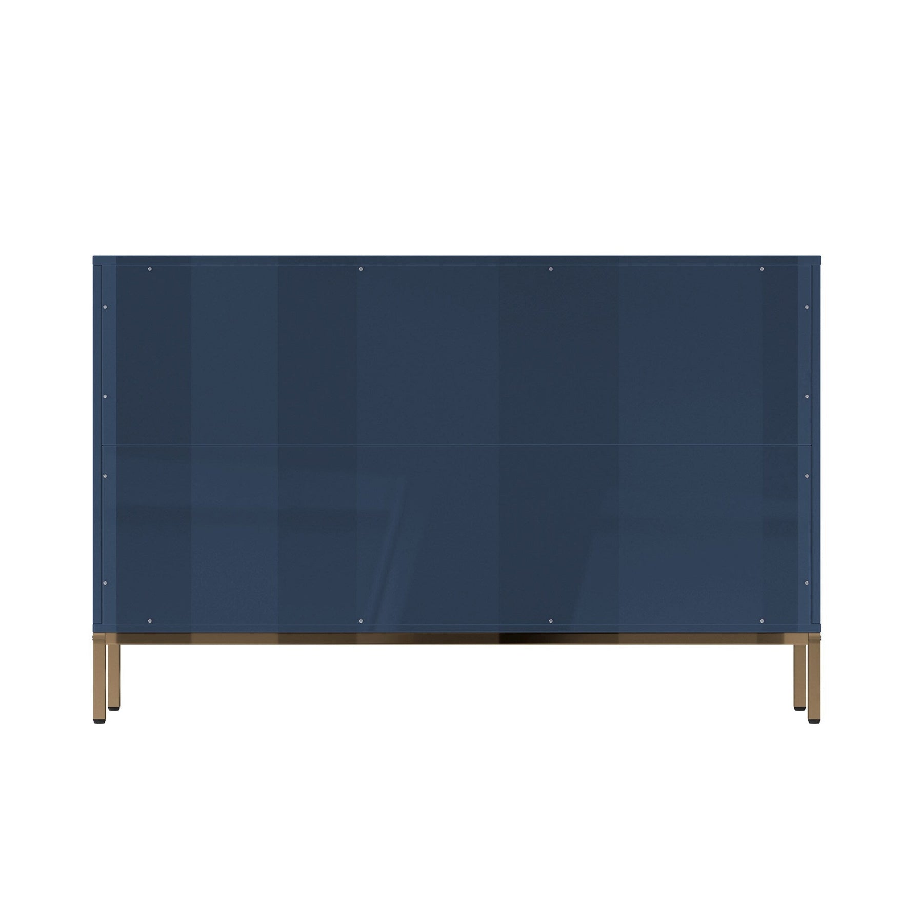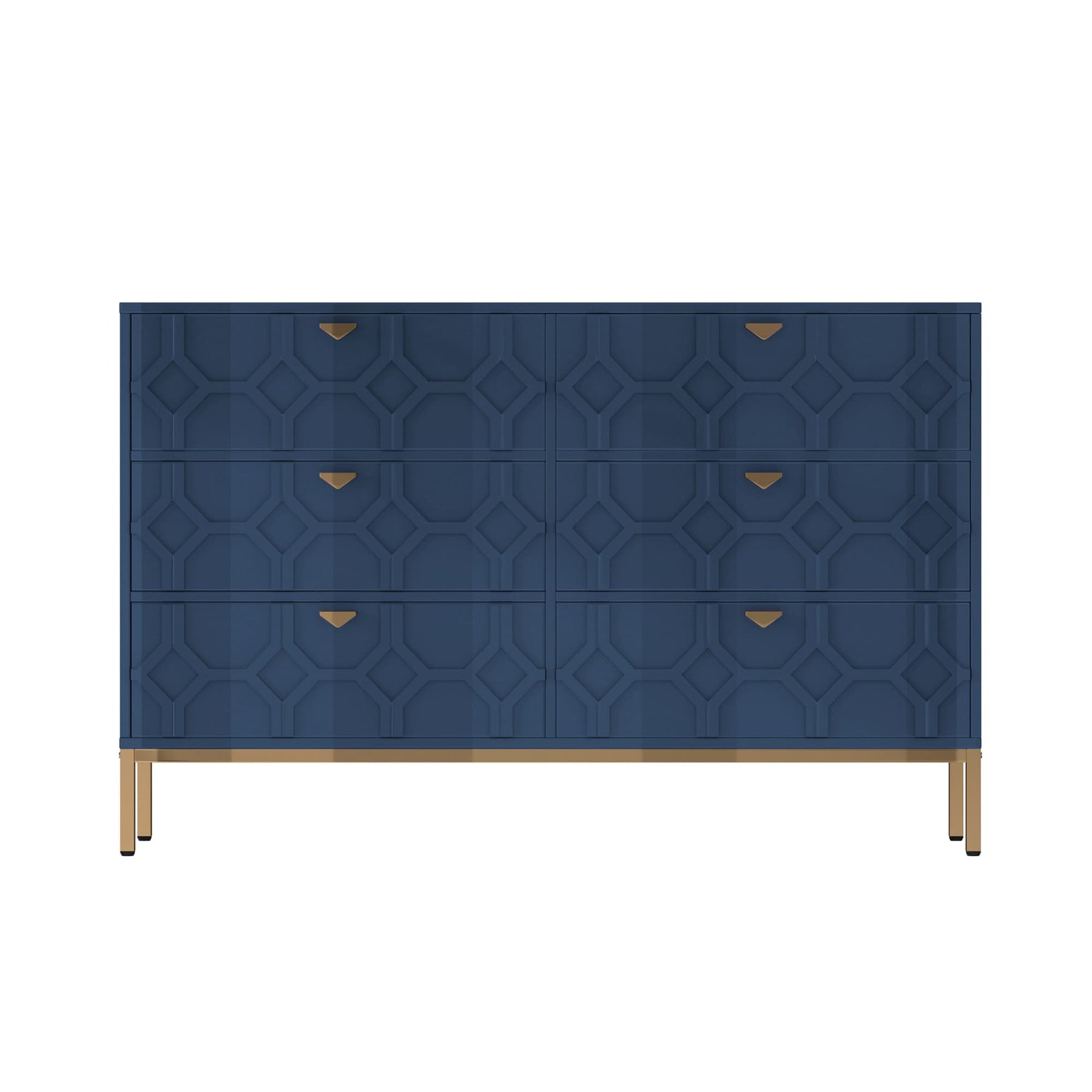 Elevate your bedroom or living room with the Clihome Blue 6-Drawer Accent Chest. This sophisticated storage solution combines a modern aesthetic with practical features, including a stunning honeycomb pattern and adjustable foot pads for stability. The deep blue finish complements the tapered gold metal legs, adding a touch of elegance to any space.