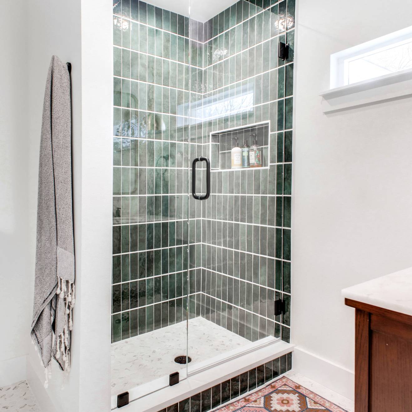 Glazed ceramic wall tile from Bedrosians’ Cloe collection, featuring rich green color variation and a smooth high-gloss finish. The 2 x 8 format delivers classic subway style with artisanal character, ideal for showers, backsplashes, and accent walls.