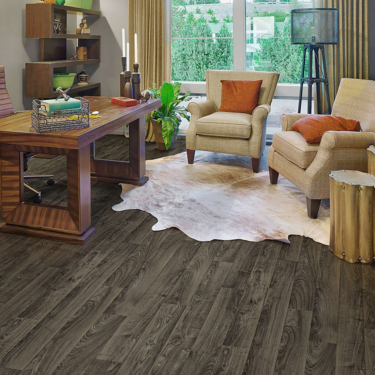 Durable sheet vinyl from Congoleum’s ArmorCore Pro UR line, featuring the Wood Ridge design in Rainy Evening. A low-gloss urethane wear layer with Stain Defense System delivers resilient, easy-care performance with the look of gray wood planks.