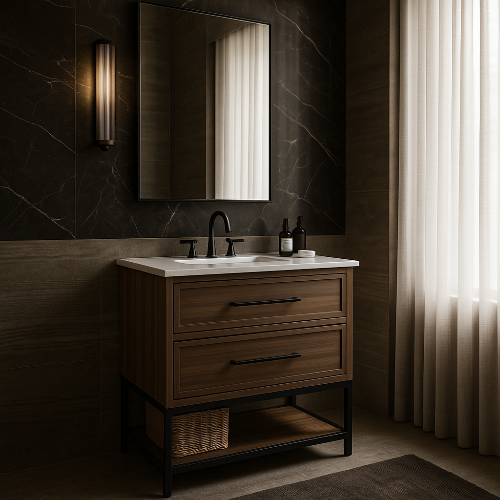 The Corley Vanity combines modern farmhouse charm with industrial elegance, featuring a spiced walnut finish, brushed gold hardware, and a durable engineered stone countertop. Perfect for enhancing any bathroom space.