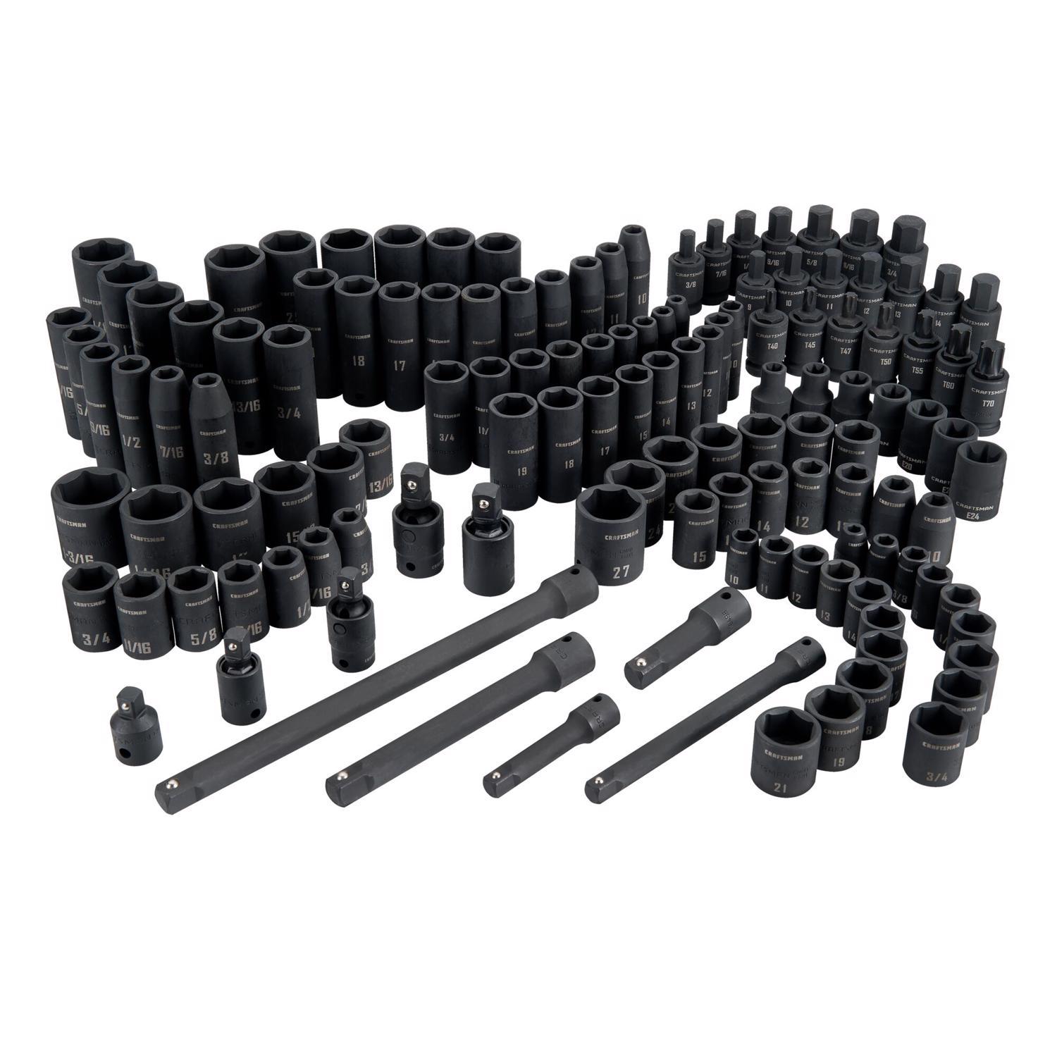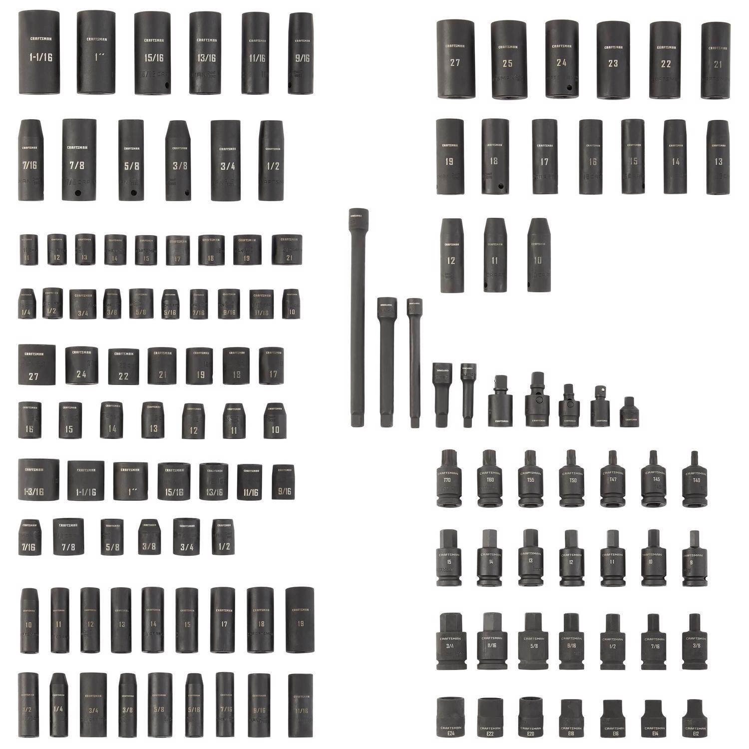 What's Included (46) Impact Shallow Hand Sockets, (46) Impact Deep Hand Sockets, (28) Impact Bit Sockets and (10) Impact Accessories