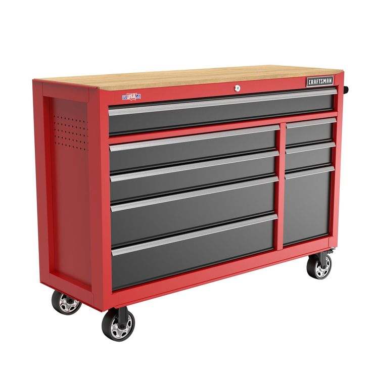 Upgrade your workspace with the CRAFTSMAN 2000 Series 51.2-in L x 37.5-in H 8-Drawers Rolling Red Wood Work Bench. With eight spacious drawers and a durable wood top, this bench offers both organization and functionality. Perfect for any craftsman or hobbyist looking for a professional and efficient workspace.
