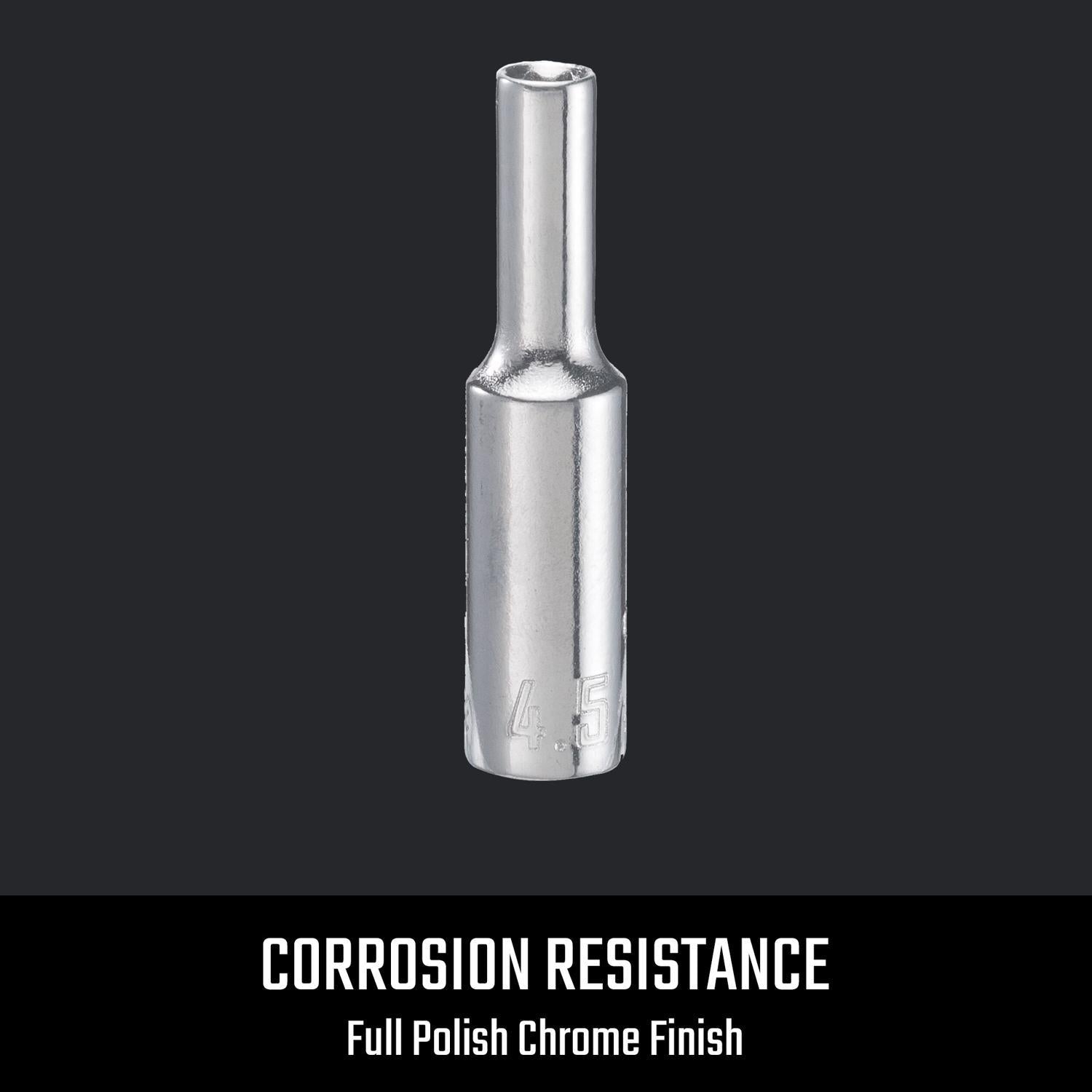 The Craftsman 4.5mm Metric Deep Socket is designed for precision and durability, featuring a polished chrome finish for corrosion resistance and a 6-point design for increased torque. Perfect for reaching hard-to-access fasteners without stripping.