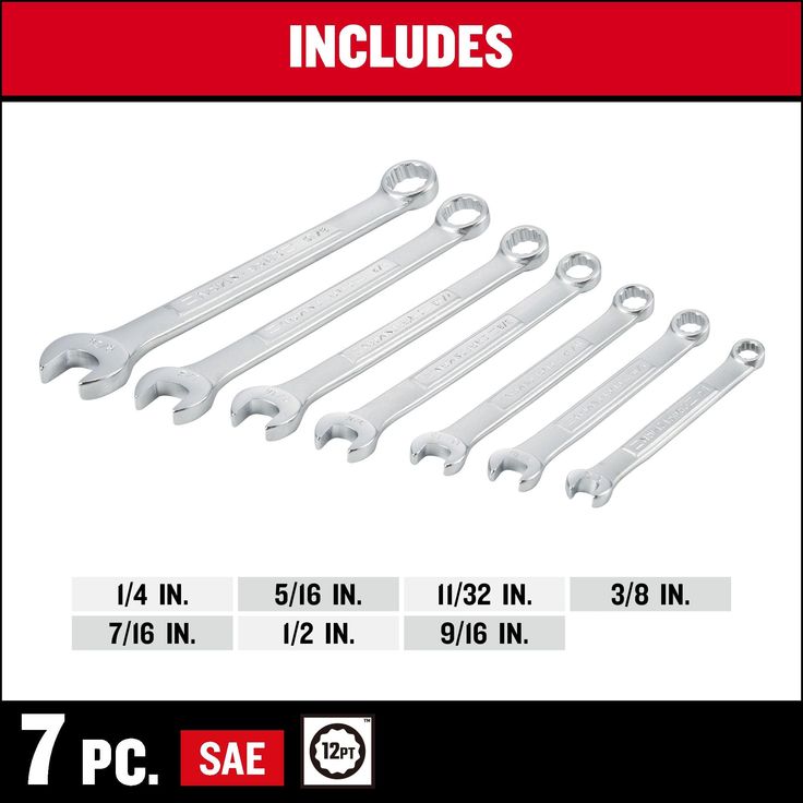 Q: What sizes are included in this set? A: The set includes 1/4-in, 5/16-in, 11/32-in, 3/8-in, 7/16-in, 1/2-in, and 9/16-in wrenches.