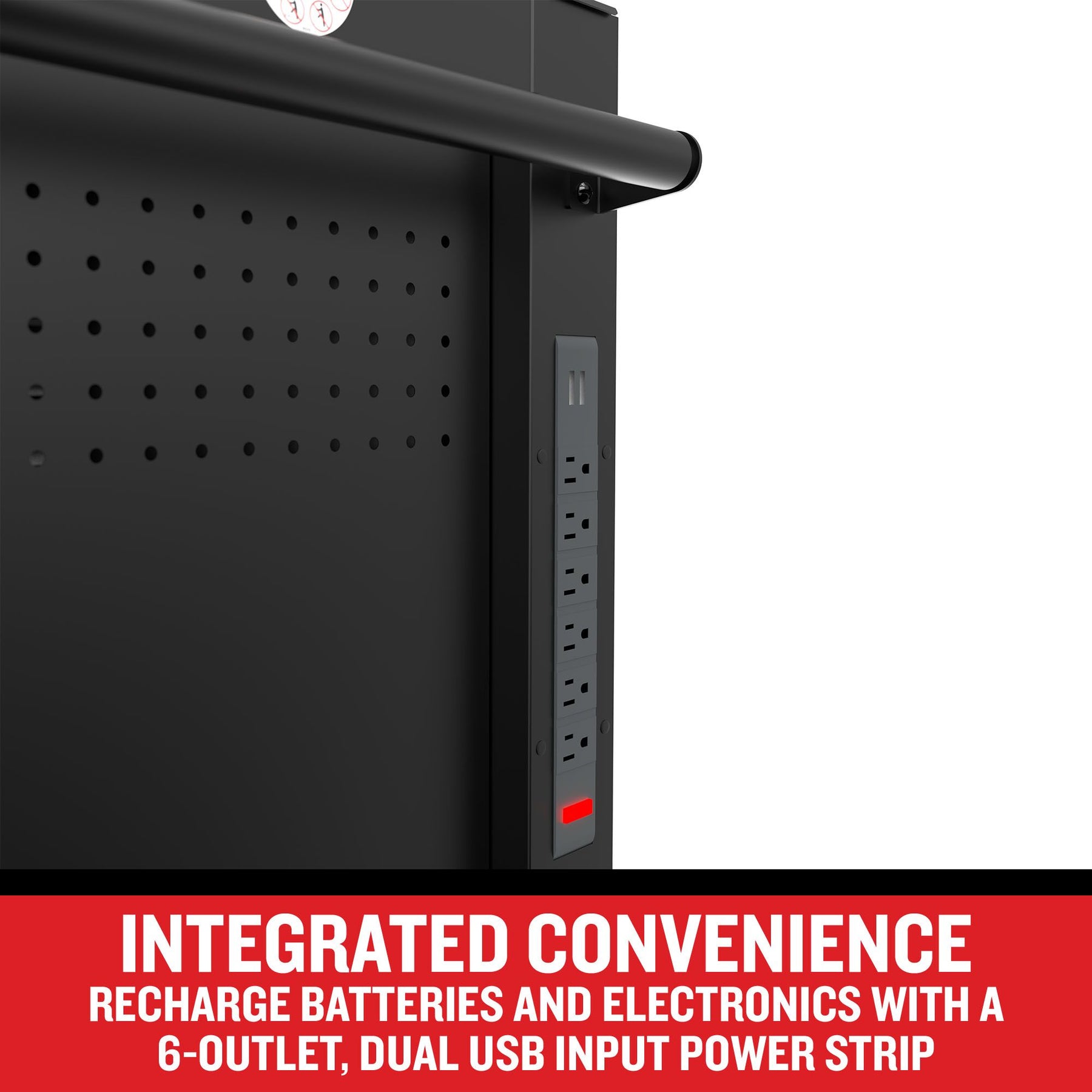 Integrated Power: Built-in 6-outlet power strip with dual USB for charging tools and electronics