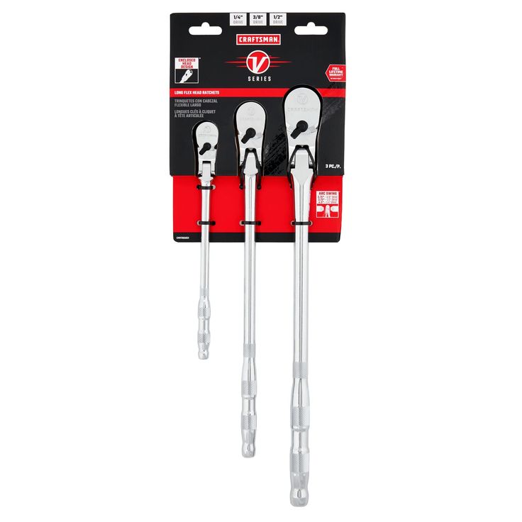 The Craftsman V-Series Flex Head Ratchet Set offers professional-grade durability and precision. Featuring 80 and 96 tooth designs, these ratchets provide a short arc swing for tight spaces, while the 180° articulating head ensures easy access to difficult fasteners.