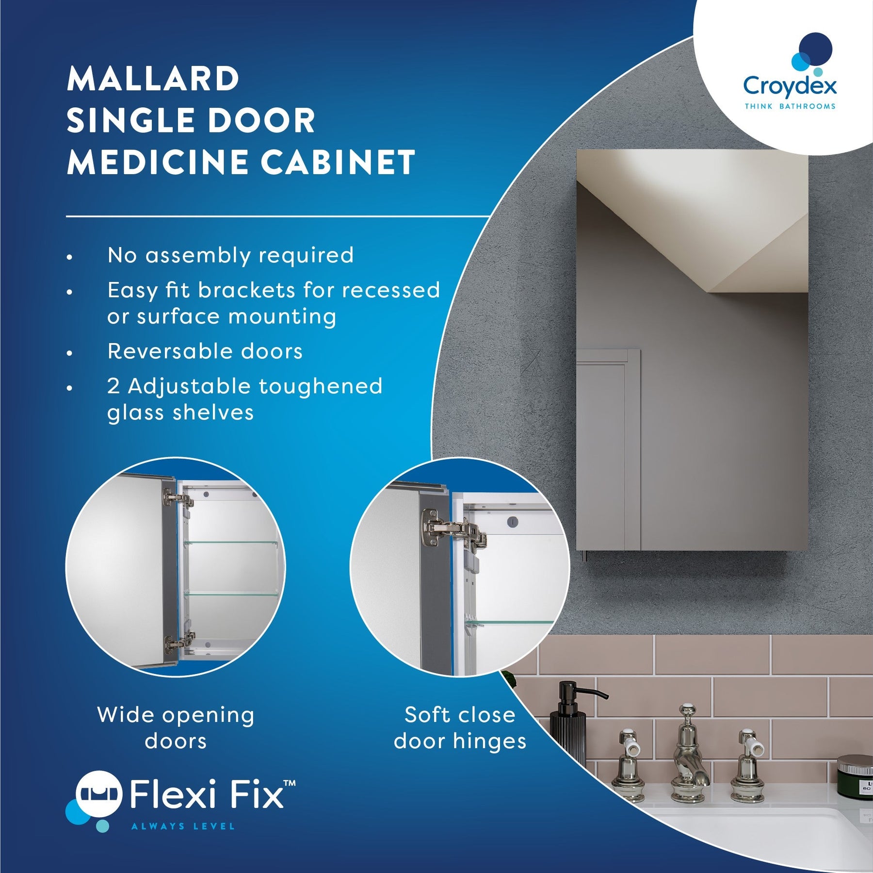Enhance your bathroom with the Croydex 15-in x 25-in Silver Mirrored Soft Close Medicine Cabinet. Crafted from high-quality aluminum, this versatile cabinet offers surface or recessed mounting options, delivering both style and functionality. Its soft-close doors and adjustable glass shelves make it an ideal choice for modern bathrooms.