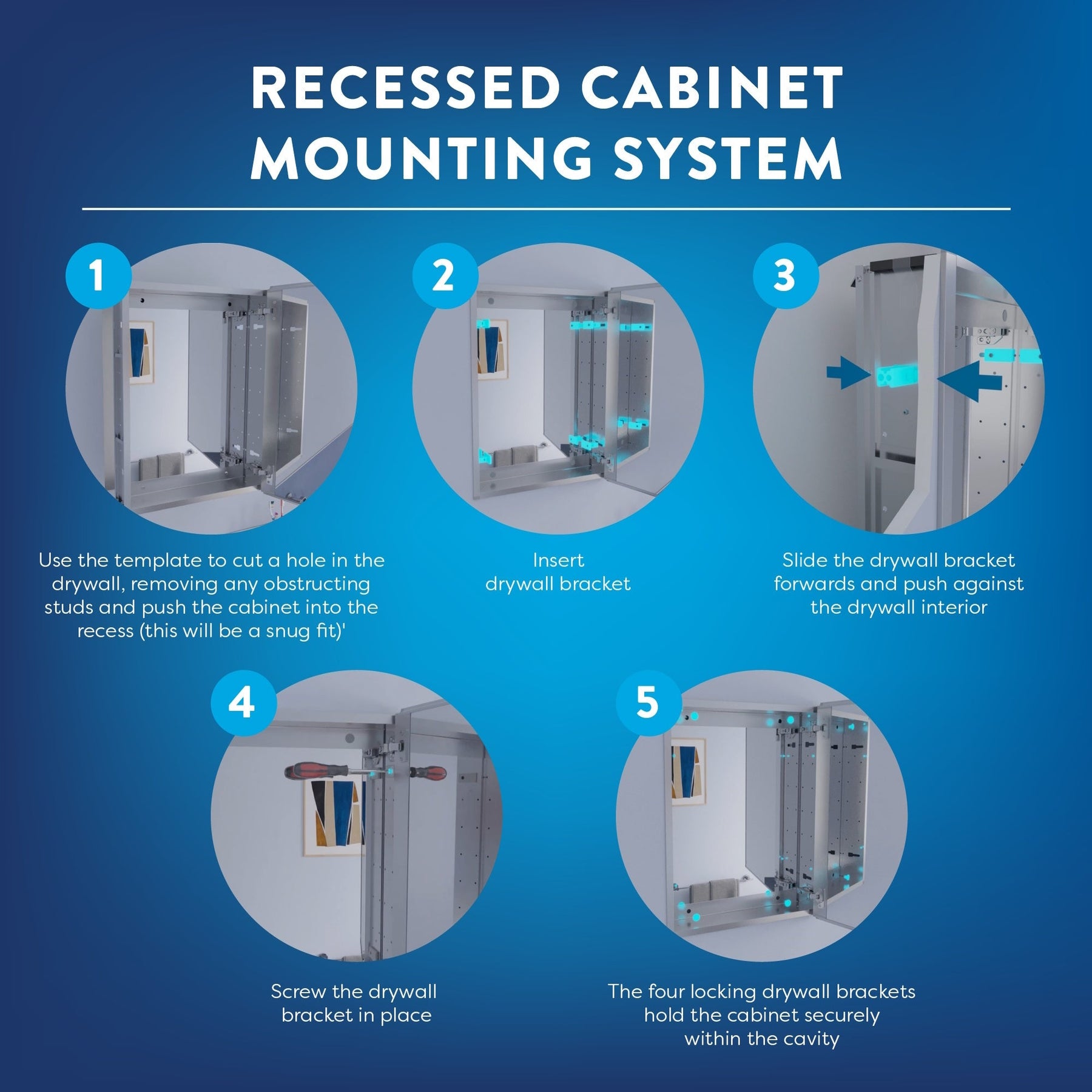 Q: Can this cabinet be installed in a recessed fashion? A: Yes, the cabinet can be recess mounted using the included brackets, which simplify the installation process.