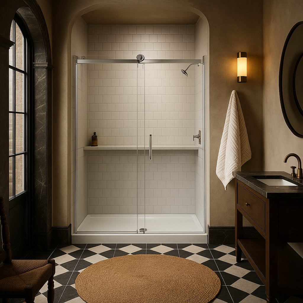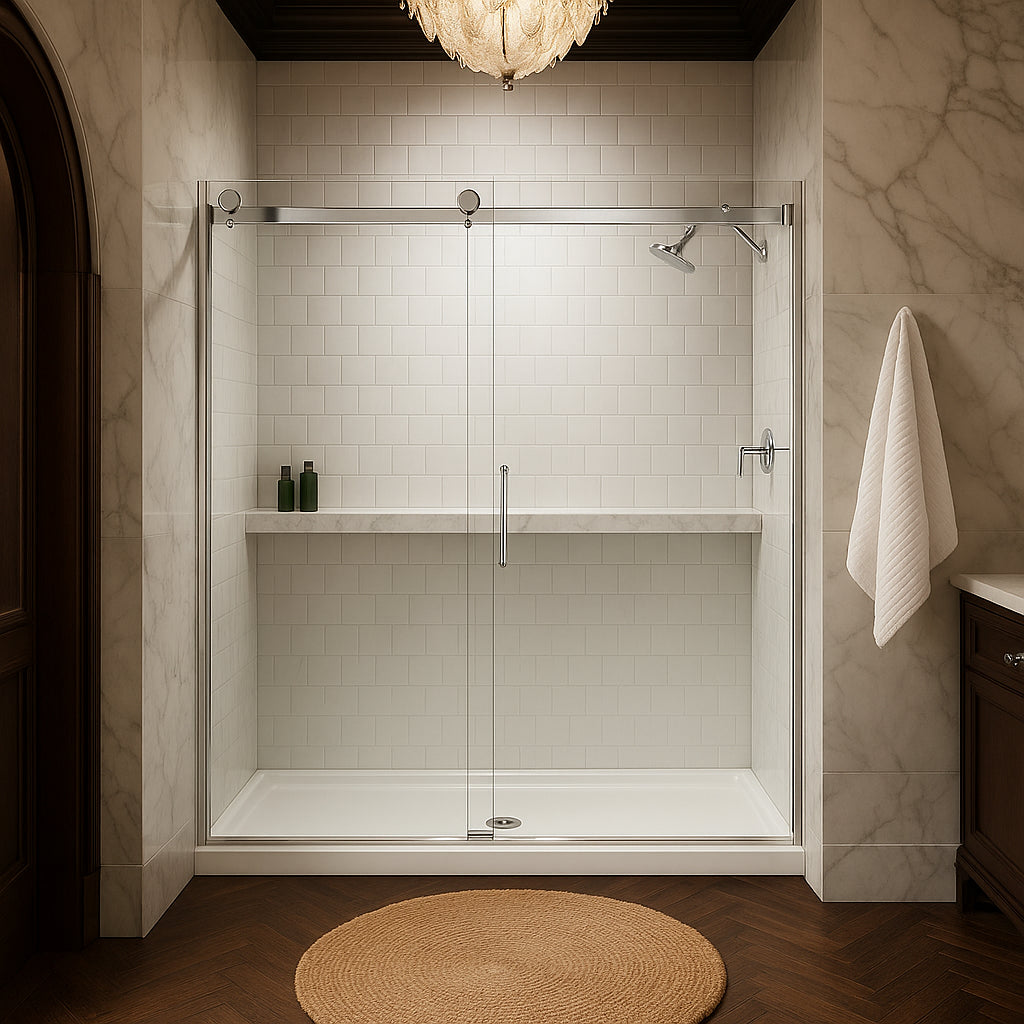 The KOHLER Cursiva sliding frameless shower door combines modern design with functionality. Featuring exposed stainless steel rollers and soft-close technology, it ensures smooth operation and durability. The crystal-clear tempered glass and hydrophobic coating make cleaning effortless while enhancing the aesthetic of your bathroom.