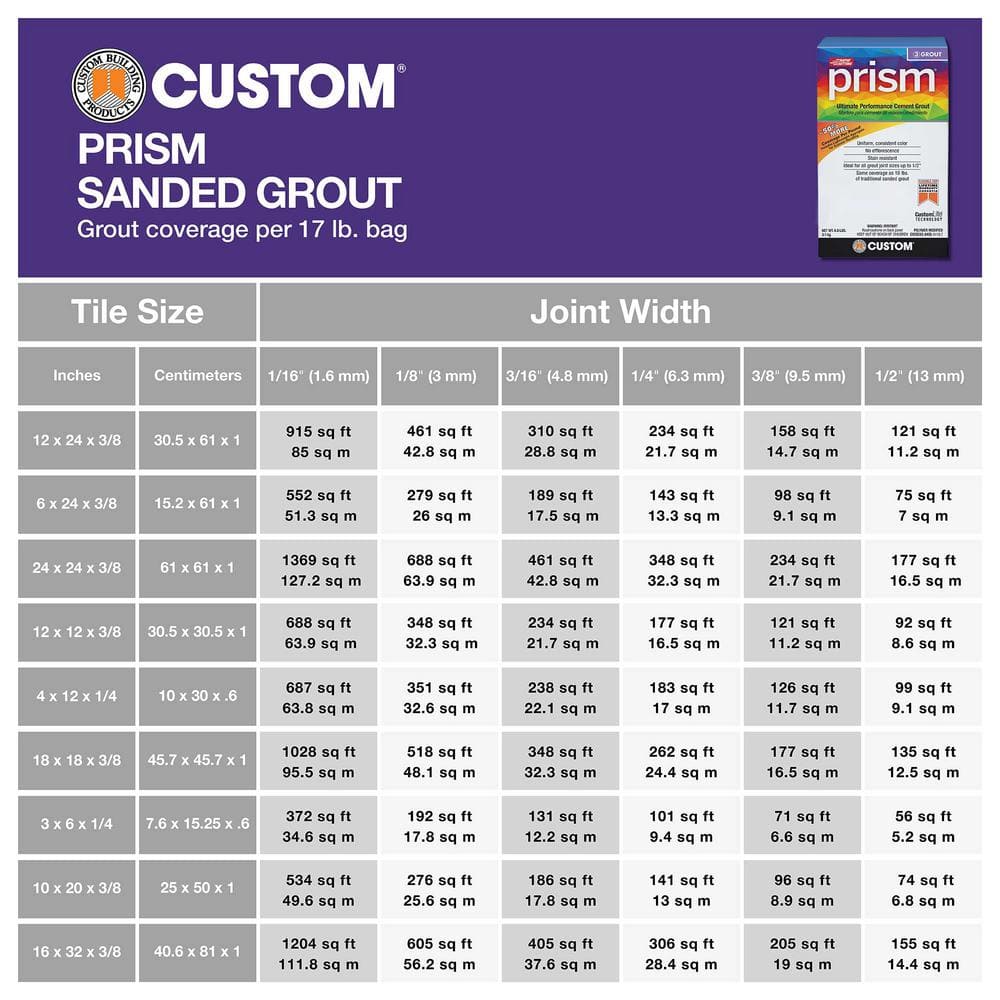 Prism Ultimate Performance Grout by Custom Building Products offers a state-of-the-art solution for all your tile setting needs. With its calcium aluminate cement-based formula, this grout ensures consistent color without efflorescence in any environment. Its rapid setting time and stain-resistant qualities make it ideal for indoor and outdoor applications, including floors, walls, pools, and spas.