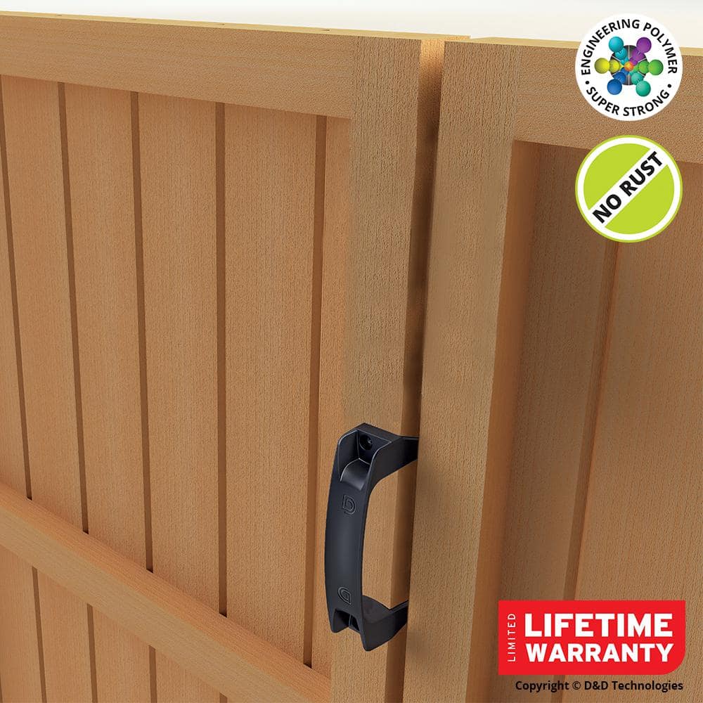 The D&D 6-1/2 in. Black Gate Handle offers a sleek and durable solution for gate opening and closing. Its engineered polymer construction ensures no rust or corrosion, providing a long-lasting, stylish addition to any metal, wood, or vinyl gate. Designed for easy installation, this handle is perfect for both commercial and household applications.