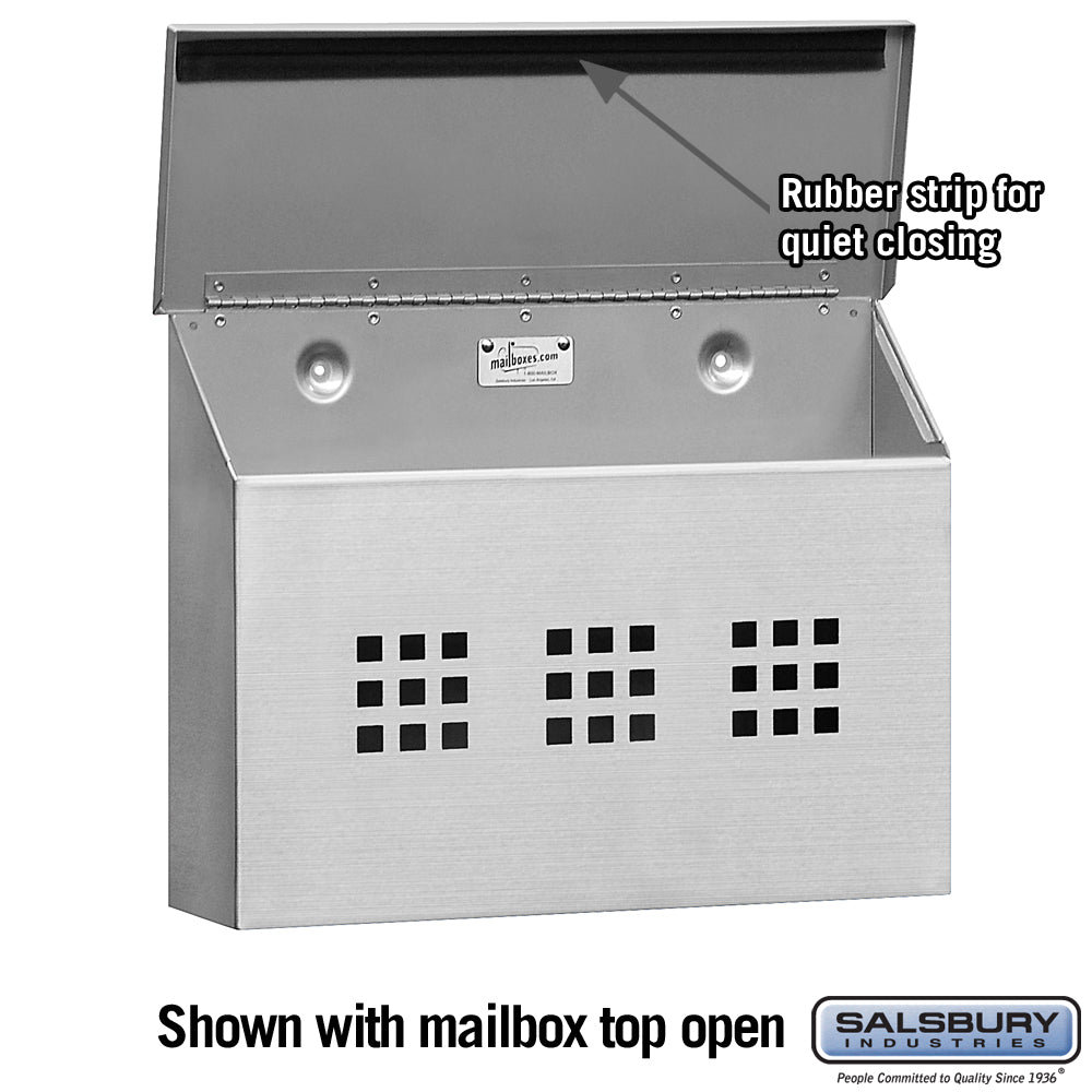 This decorative stainless steel mailbox combines functionality with style, featuring a horizontal design and a satin finish. Made from durable 20 gauge stainless steel, it offers secure mail storage and a privacy plate option.