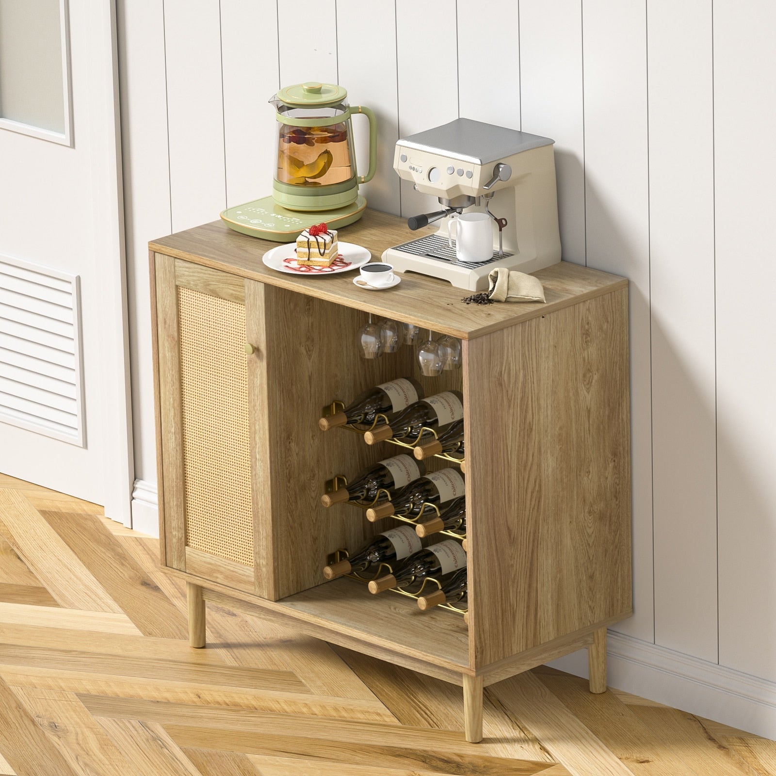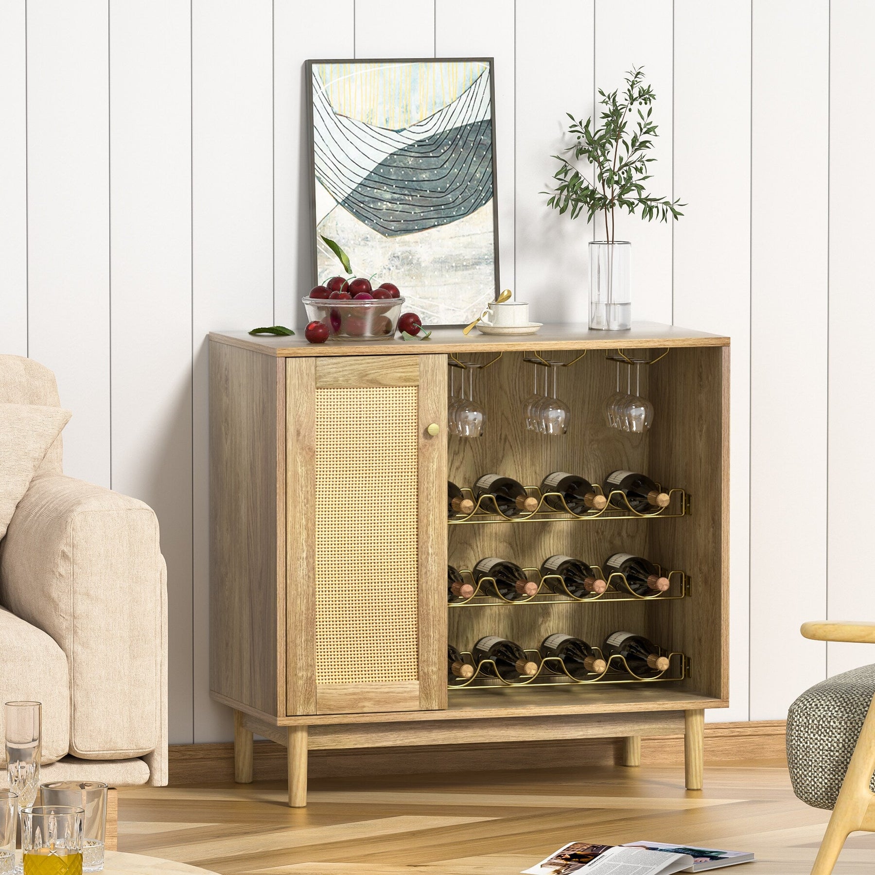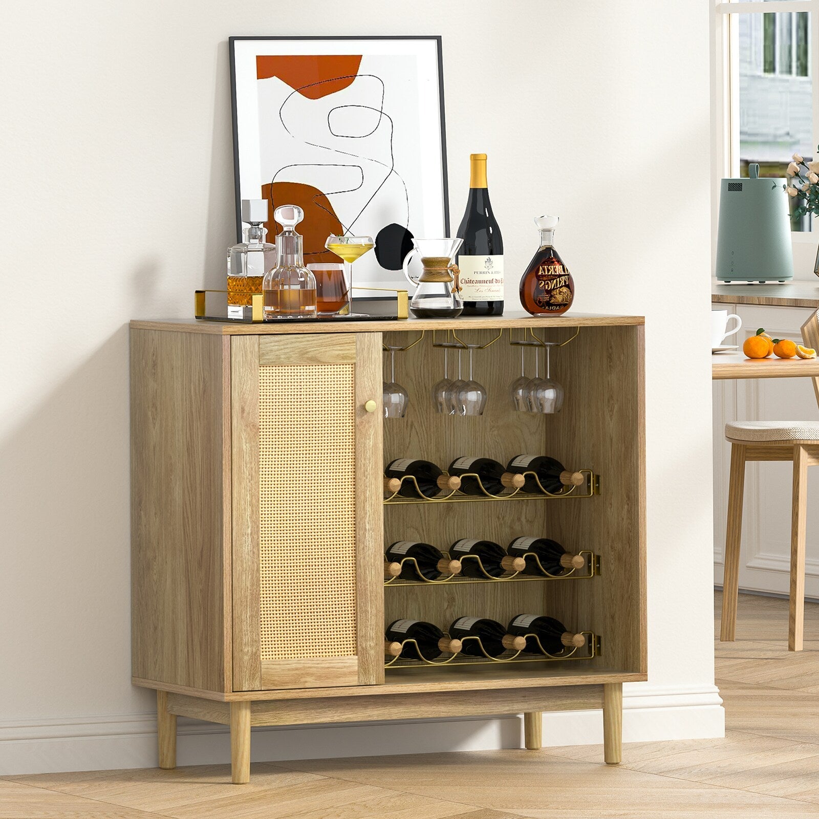 Enhance your dining area with the Delarpo Oak Wood Wine Cabinet, a perfect blend of rustic charm and modern functionality. Built with particle board, solid wood legs, and natural rattan, this cabinet accommodates 12 wine bottles and offers ample storage for stemware and dining essentials. Its oak finish beautifully complements any farmhouse or mid-century modern décor.