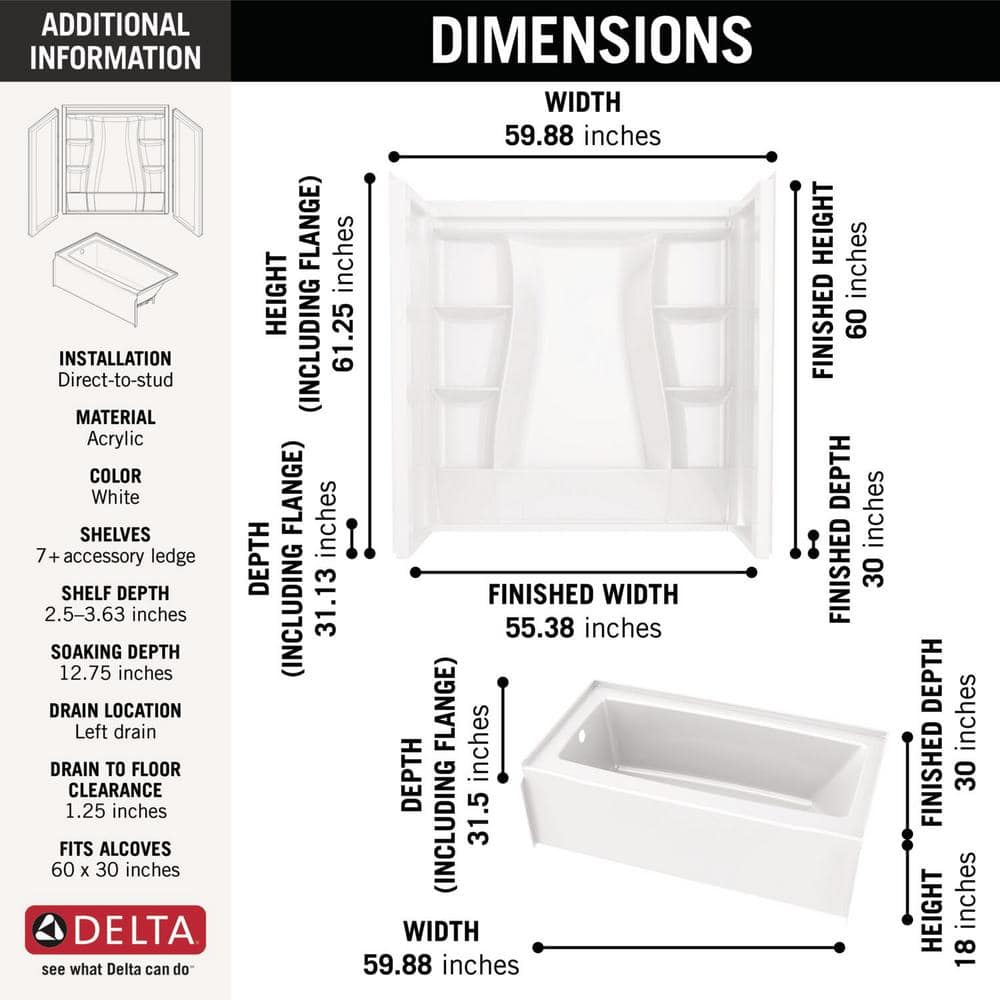 Complete Combo Kit: Includes 60 x 30 in. left-drain soaking tub and 3-piece direct-to-stud wall surround