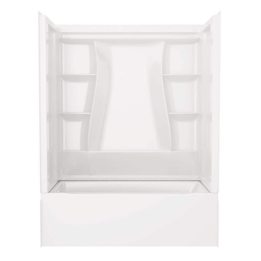 Complete alcove tub-and-wall system designed for fast, direct-to-stud installation. High-gloss white acrylic resists chipping and is easy to clean, while seven integrated shelves and an accessory ledge keep essentials organized.