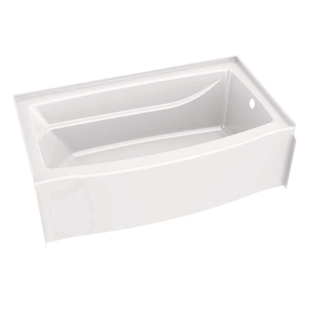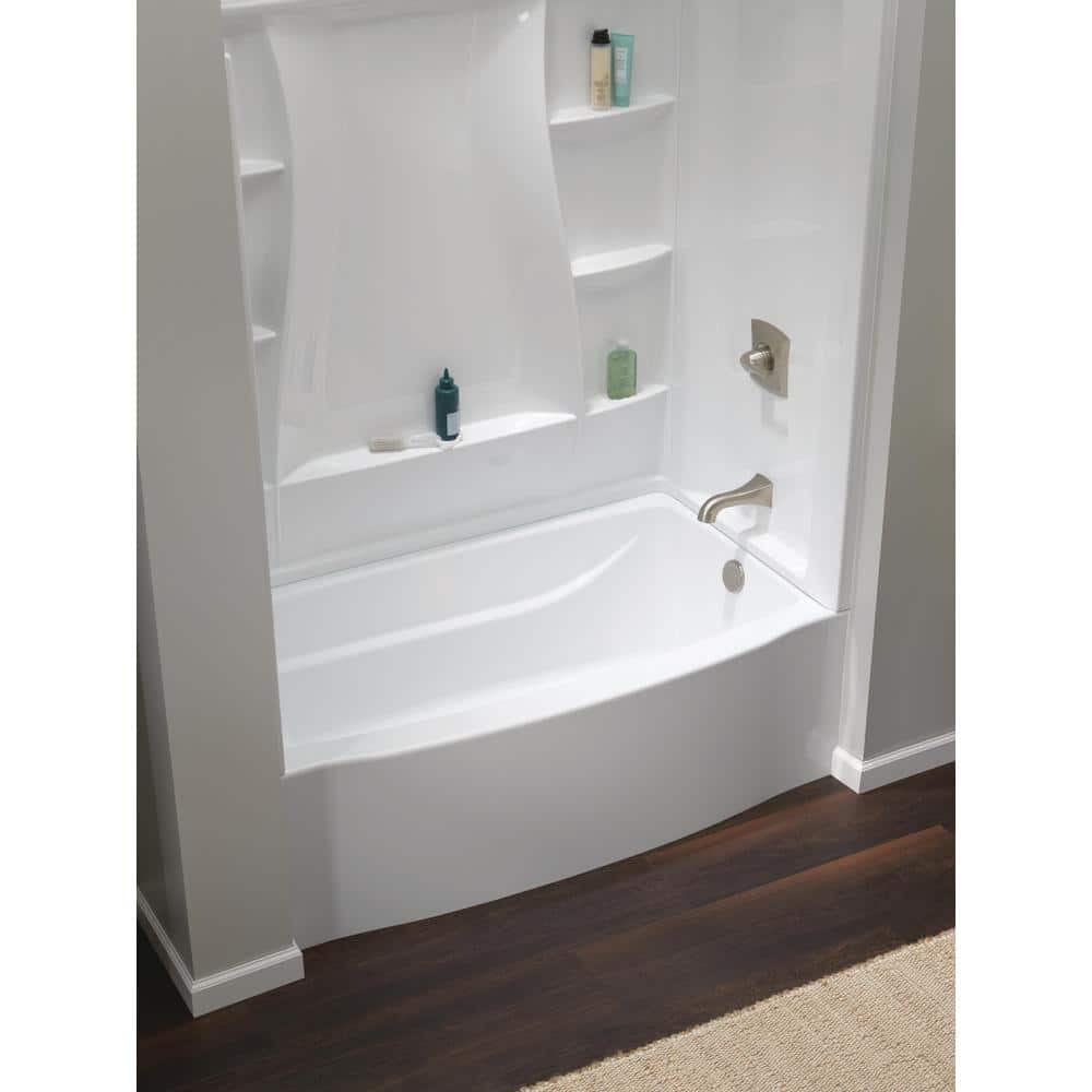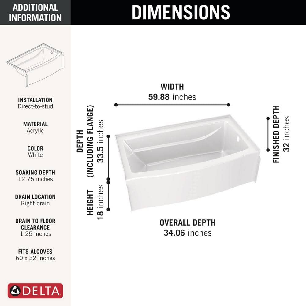 A deep-soaking alcove bathtub designed to install direct-to-stud, the Delta Classic 500 Curve adds 10% more bathing space with its curved front. Durable high-gloss white surface is easy to clean and engineered for a secure, caulkless setup.