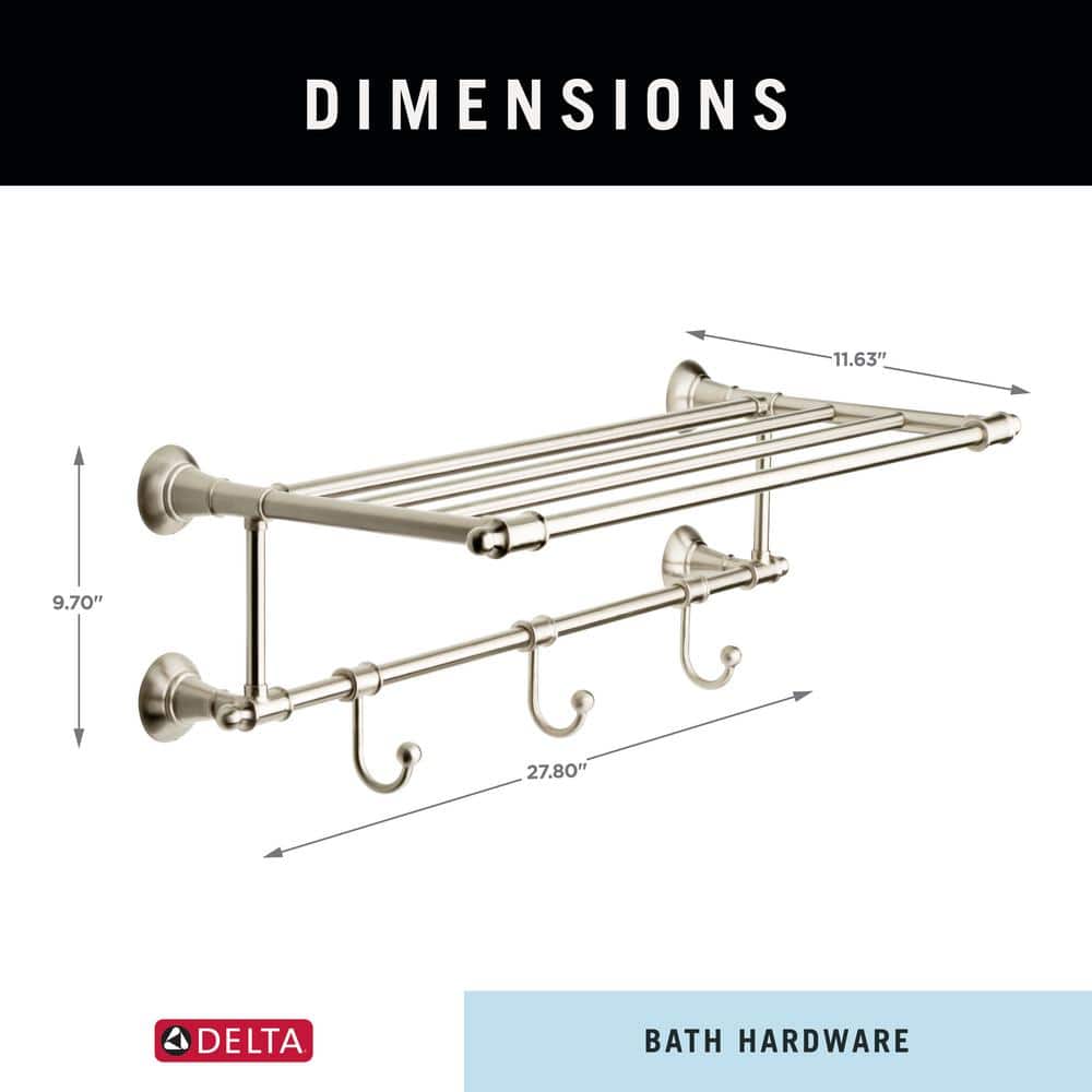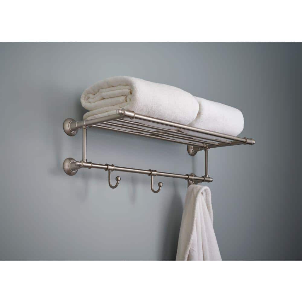 Maximize bathroom storage with this Delta Hospitality Extensions 24-inch train rack shelf in brushed nickel. The wall-mounted design adds a upper shelf for folded towels plus three sturdy hooks below, delivering everyday convenience in a durable, spot-resistant finish.