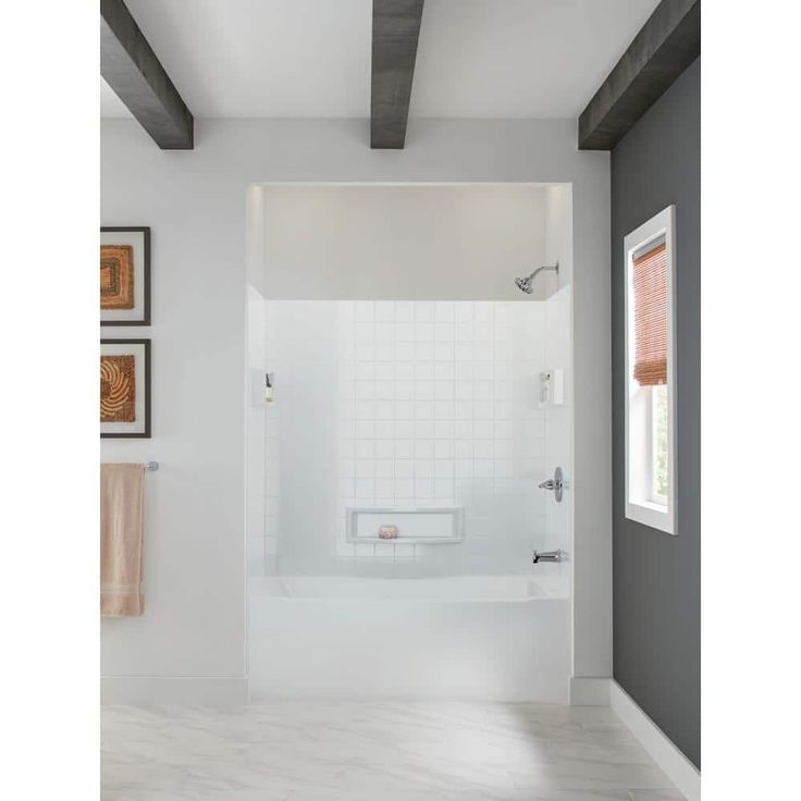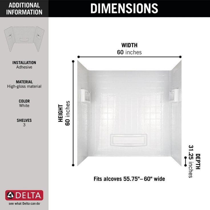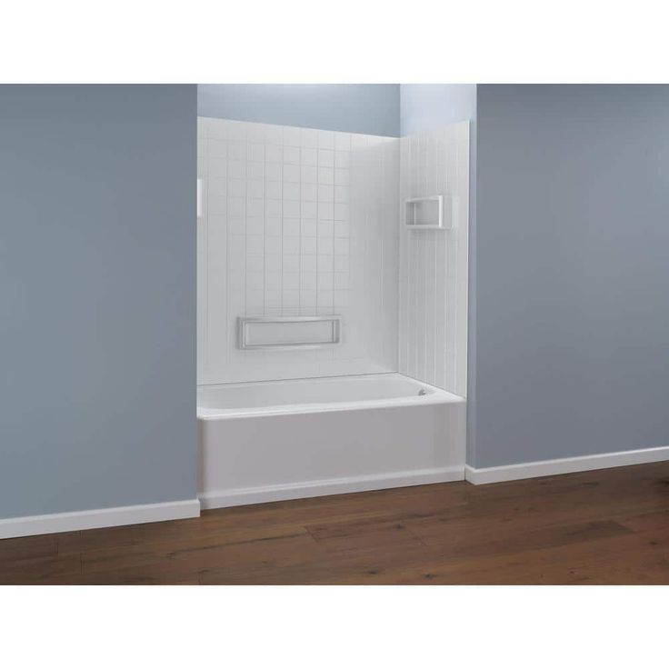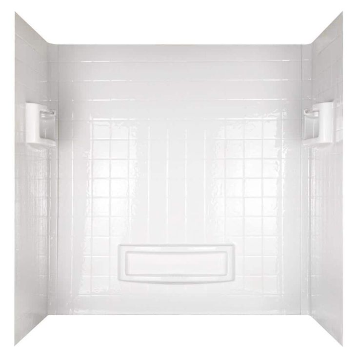Enhance your bathroom with the Distinction 60 in. W x 60 in. H Three Piece Glue Up Tub Surrounds in High Gloss White. Designed to fit bathtub alcoves up to 60 in. W x 310 in. D, this 3-piece wall set offers a perfect fit. Its high gloss white finish features a stunning 4 in. x 4 in. hammered tile-like design, while 3 shelves and 2 integrated towel bars provide convenient storage options.