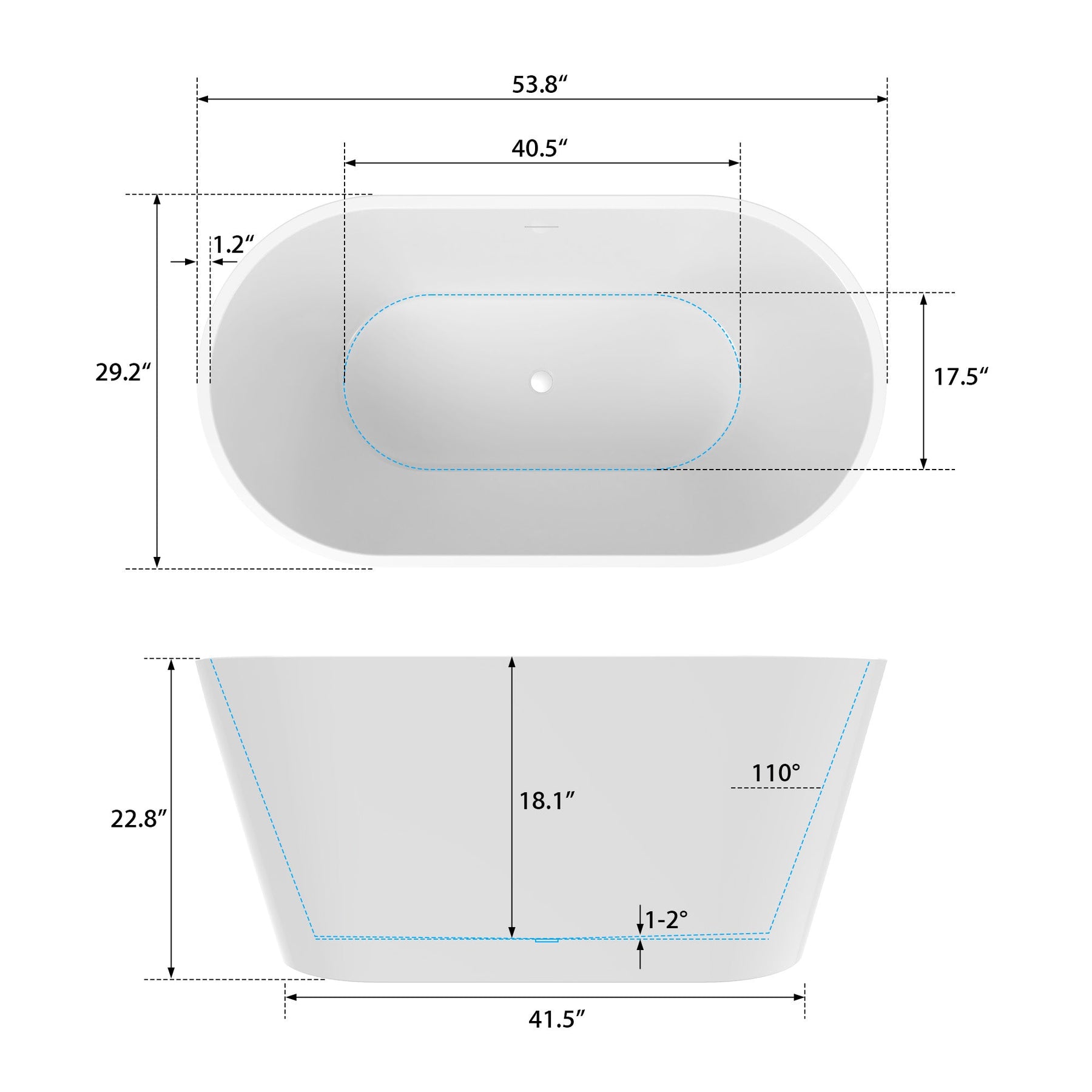 Q: What are the overall dimensions of the 54-inch model? A: Approximately 53.8 in L x 29.2 in W x 22.8 in H; soaking depth about 18.1 in (per diagram).