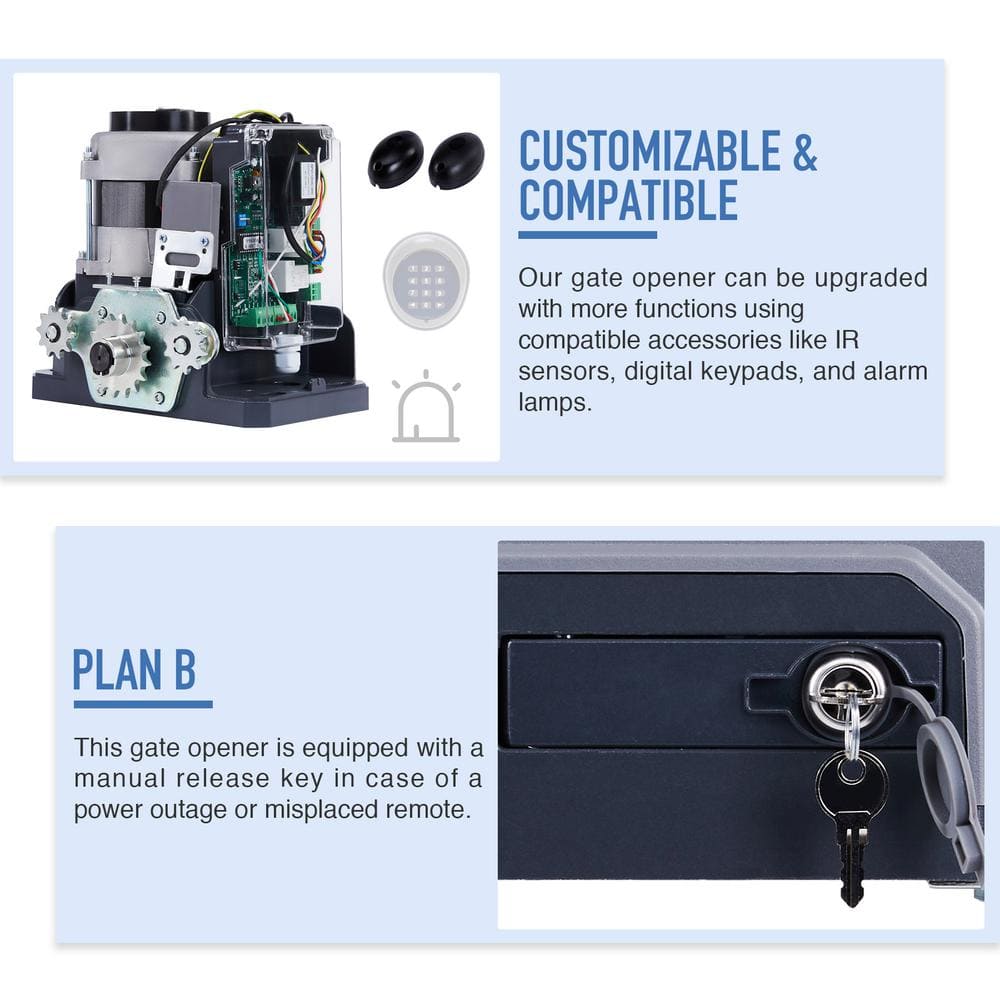 The DOORADO Smart Slide Single Automatic Gate Opener is the perfect solution for effortless home security. Powered by a robust 550W motor and designed to handle gates up to 3300 lbs and 40 feet in length, it combines power with safety features like IR sensors and customizable auto-close settings. Enjoy peace of mind with anti-hacking technology and manual failsafe options.