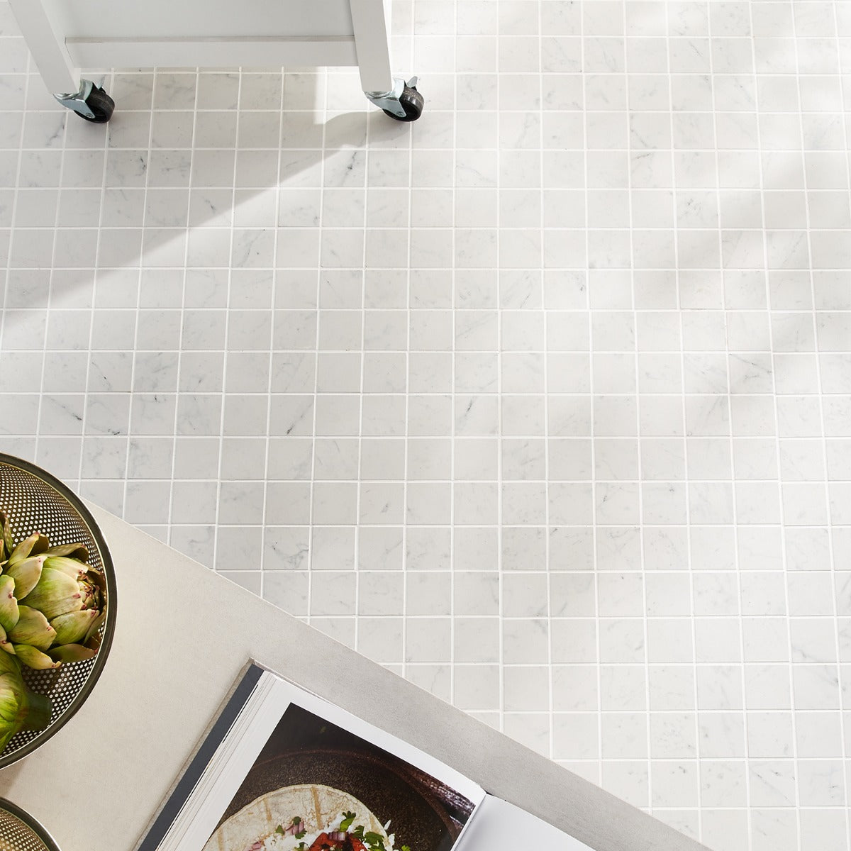 Q: What is the tile made of? A: The tile is made of high-quality porcelain, designed to replicate the look of Carrara marble.