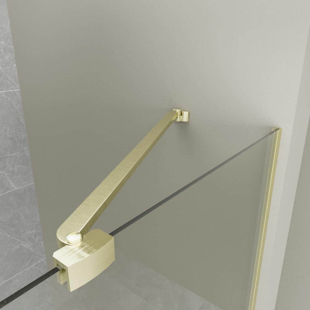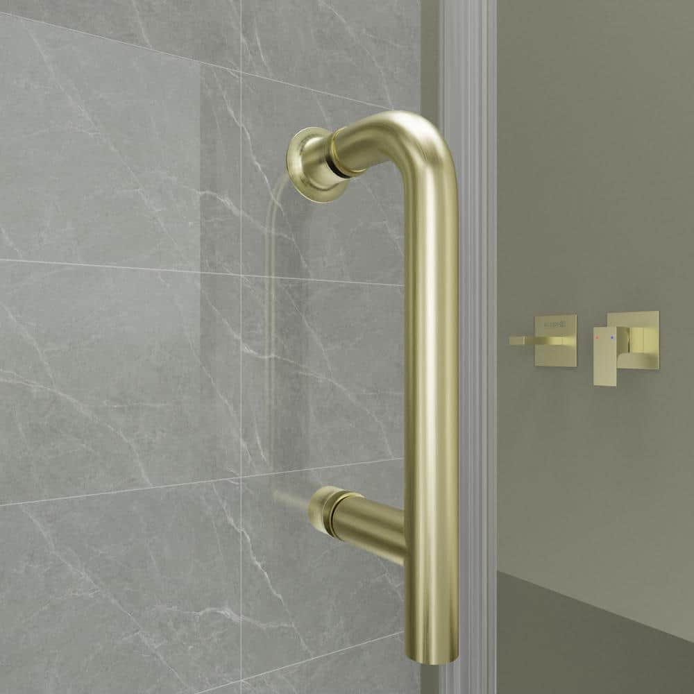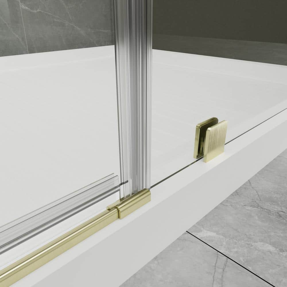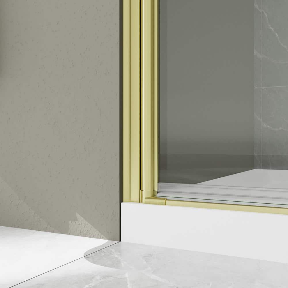 Q: What maintenance is required to keep the shower door looking new? A: Regular cleaning with a non-abrasive glass cleaner and soft cloth is recommended to maintain the clarity of the glass and shine of the brushed gold finish.