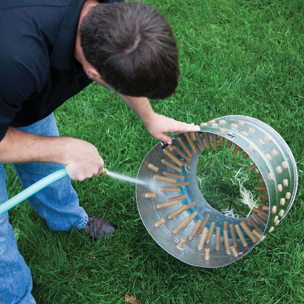 Q: Is the machine easy to clean? A: Yes, the machine features an integrated irrigation ring that connects to a garden hose for simple debris collection and cleanup.