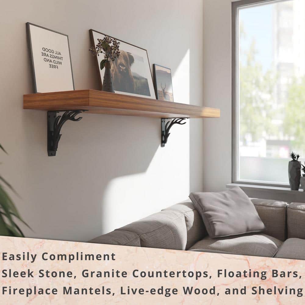 Transform your space with Starby's Elk Lodge Antler Black Steel Shelf Brackets, crafted for durability and elegance. Made from superior American steel, these decorative brackets hold over 500 lbs and feature an intricate antler design for a touch of rustic sophistication.