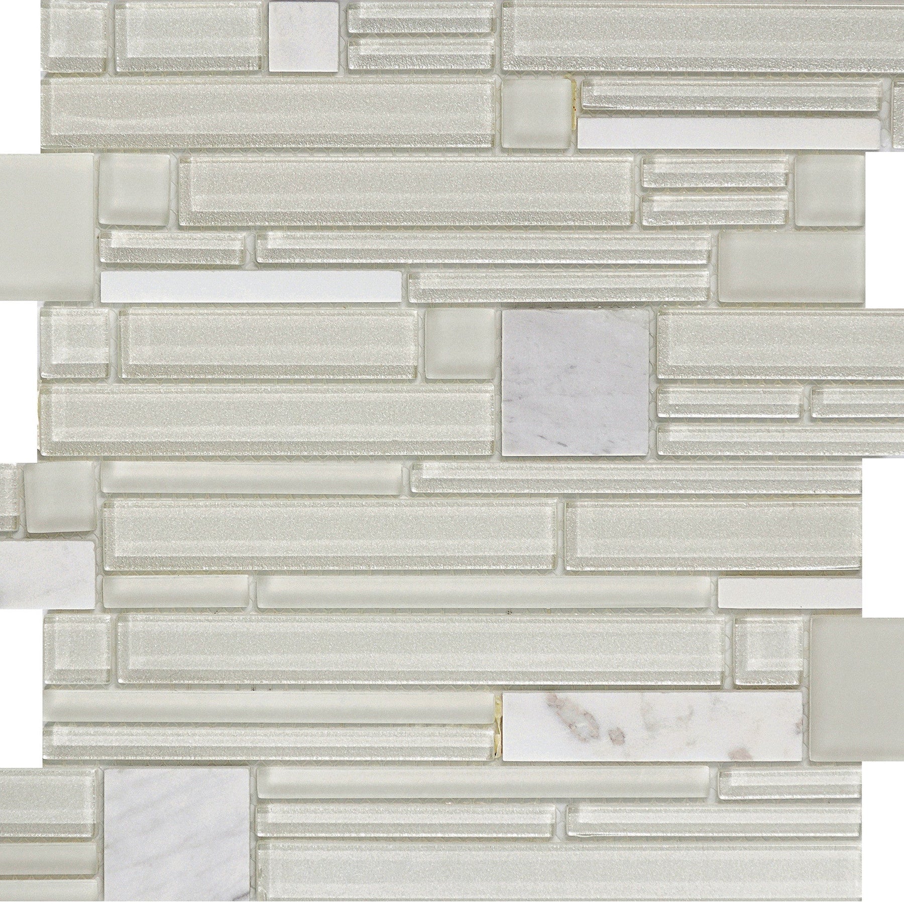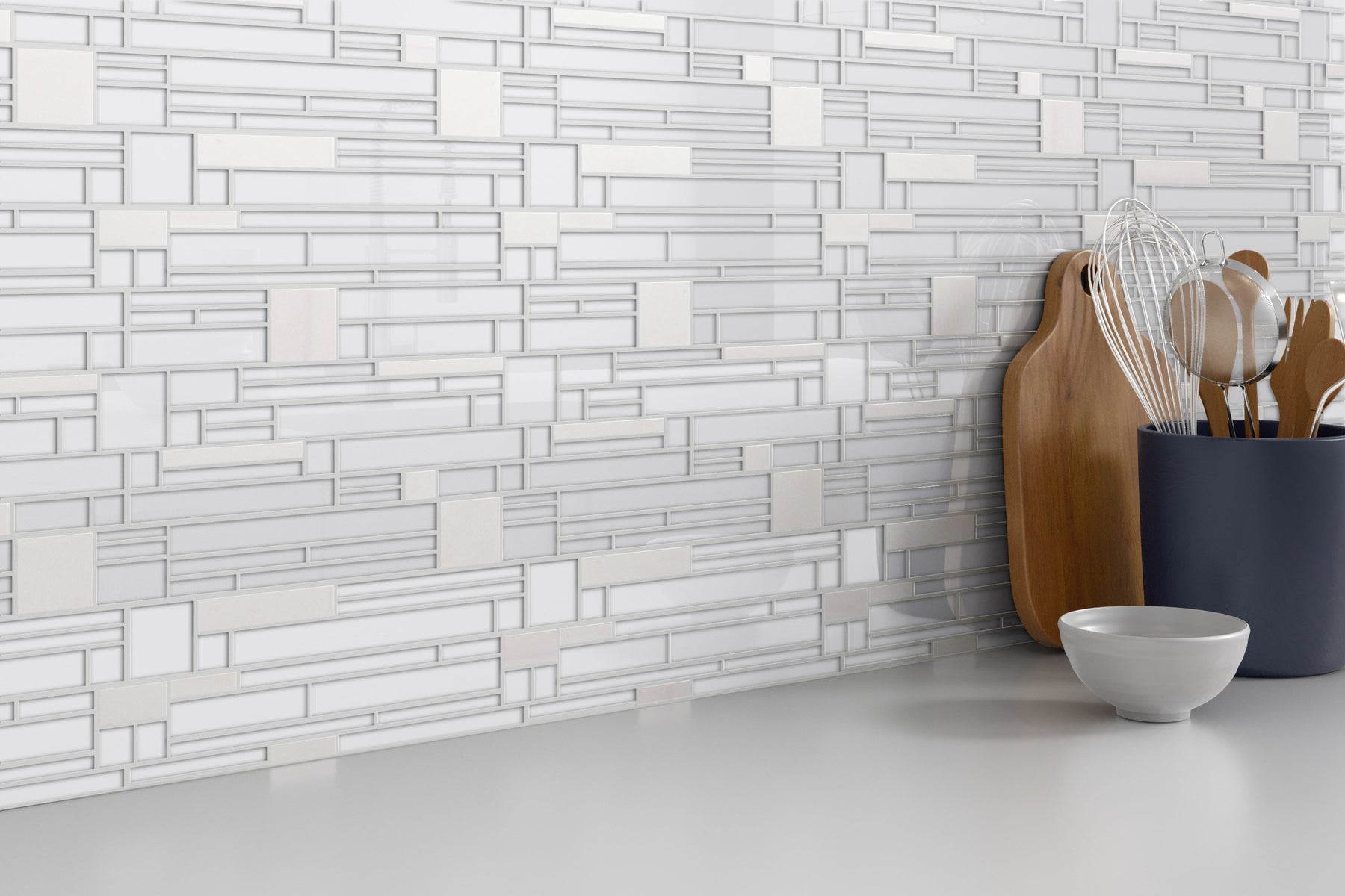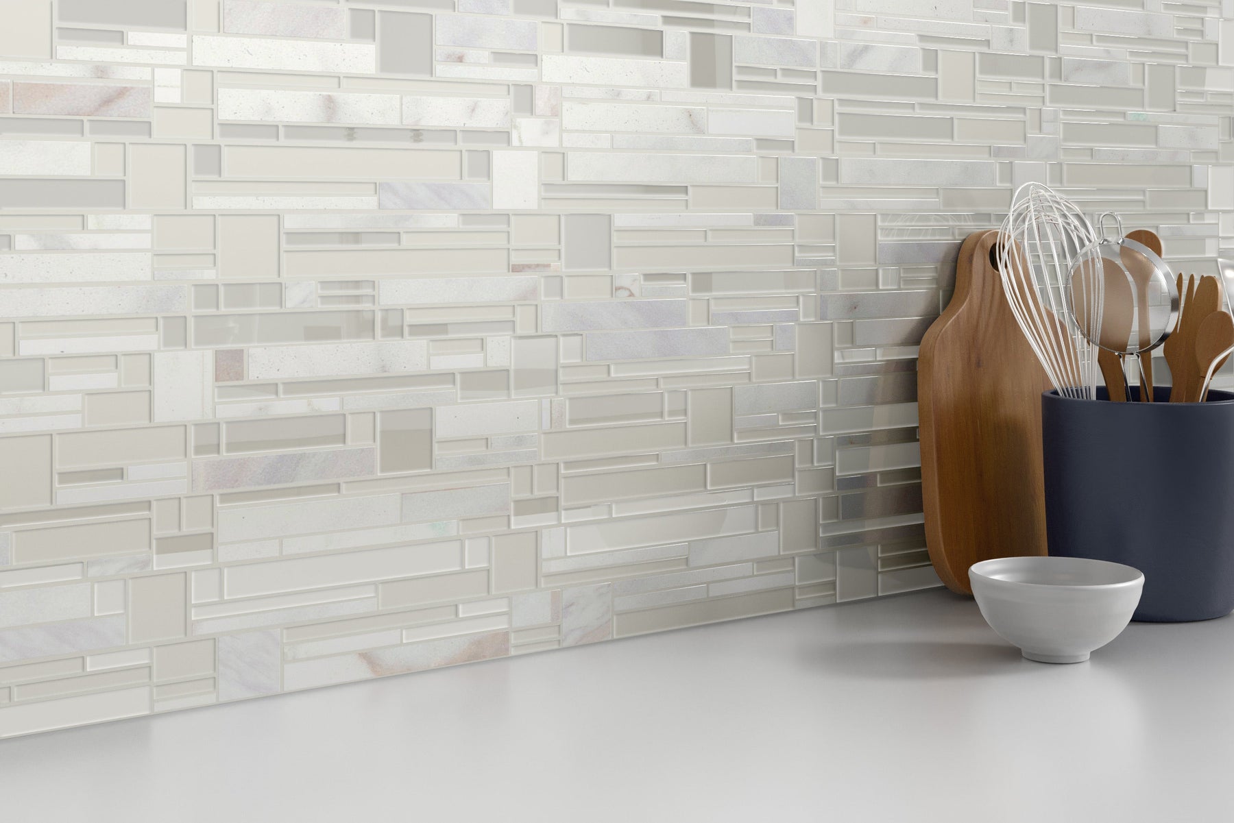 A contemporary glass-and-stone mosaic from Emser, Entity brings sleek linear texture and glossy sheen to walls and backsplashes. The 12 x 12 decorative mesh sheet installs easily, creating a dynamic pattern ideal for kitchens, baths, and feature walls.