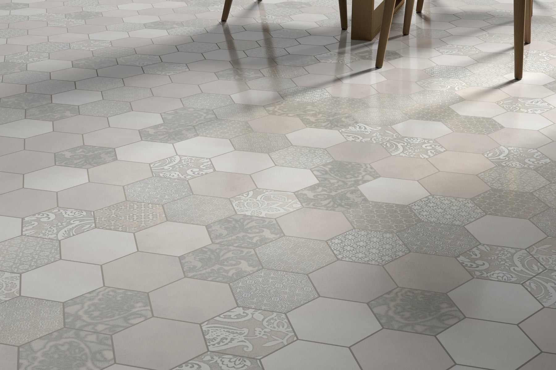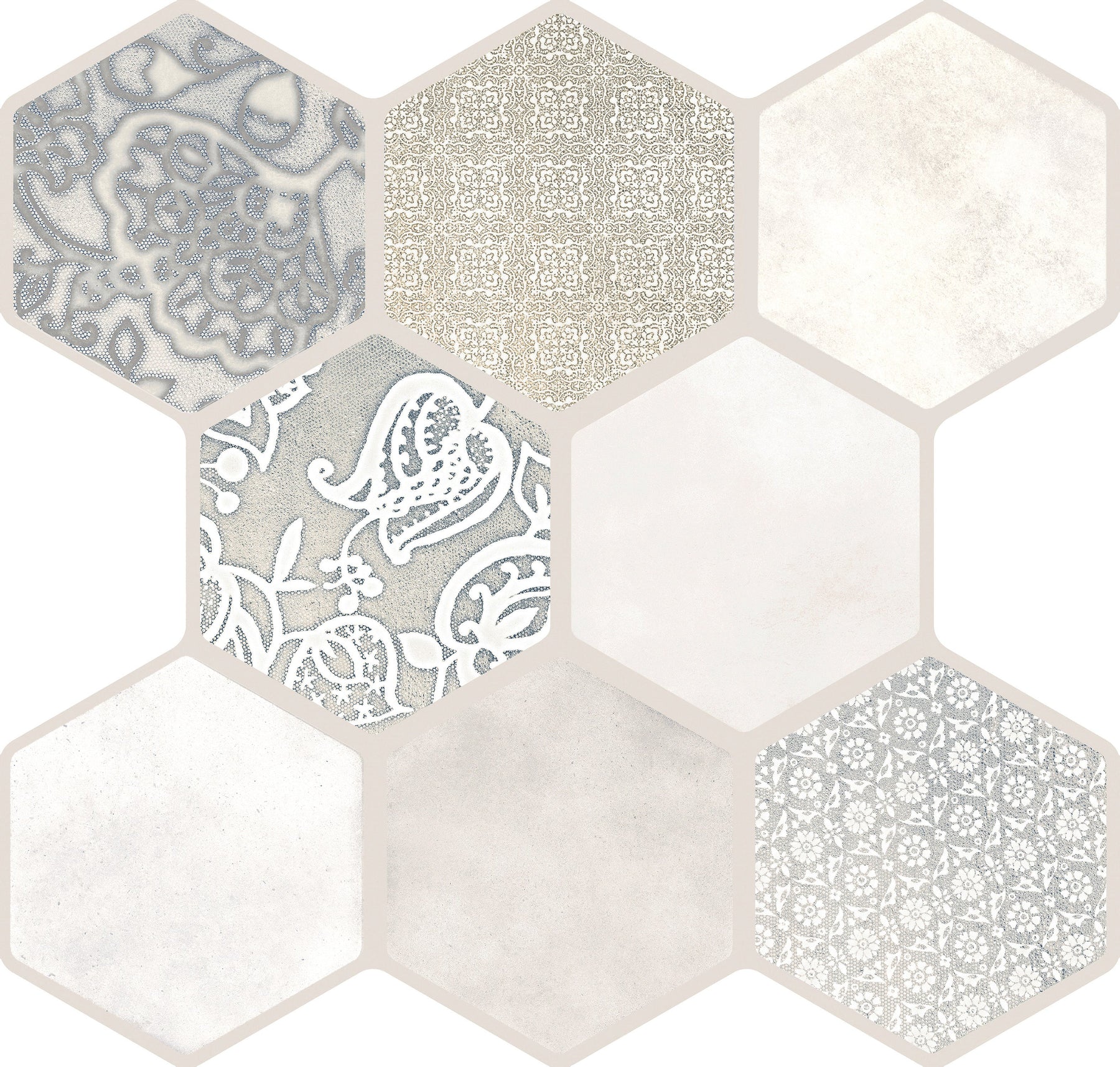 Interlocking glazed porcelain tiles create a seamless hexagon/octagon mosaic look with a mix of ornate patterns and soft textures. Designed for floors and walls, the durable porcelain body offers low water absorption and high scratch resistance for residential or commercial spaces.
