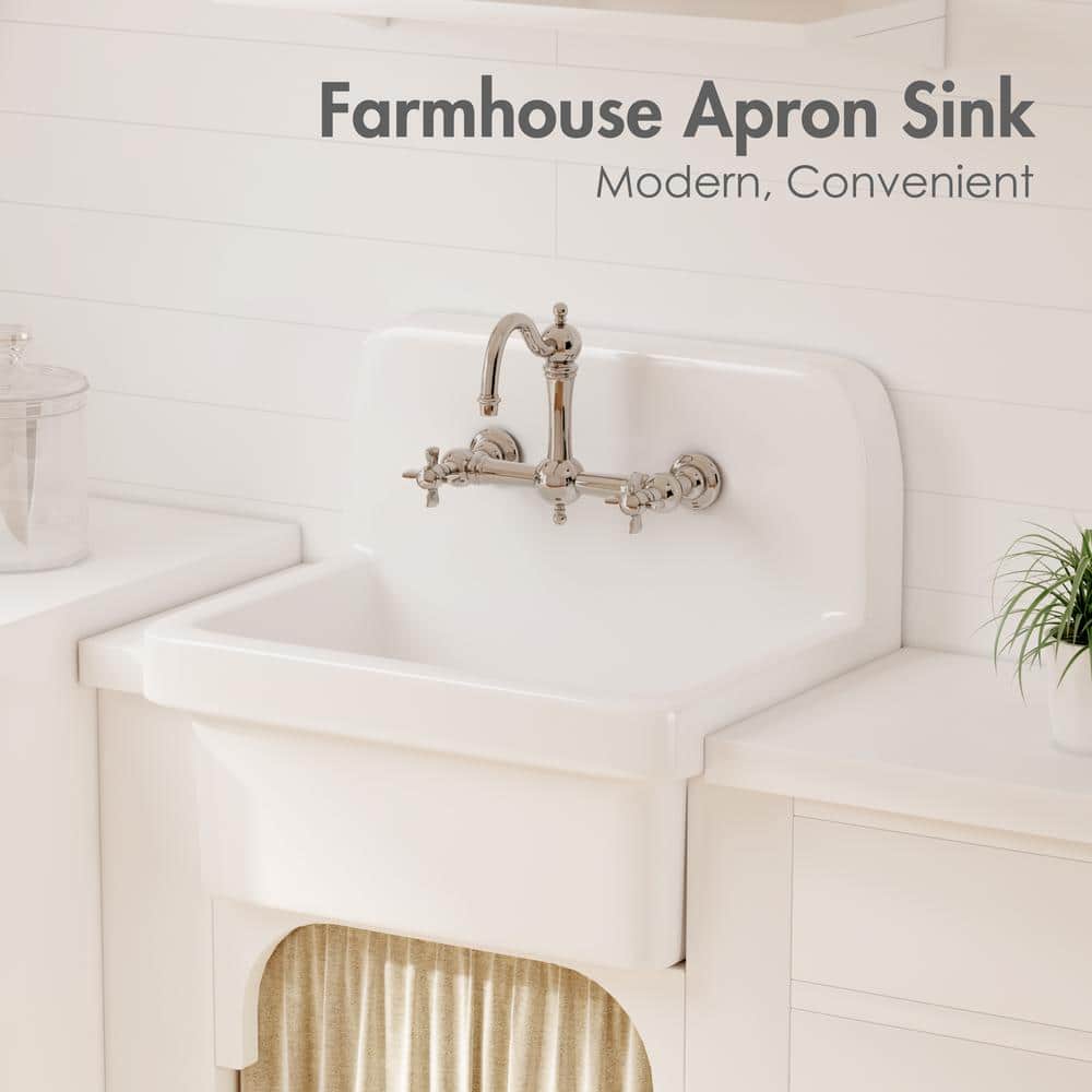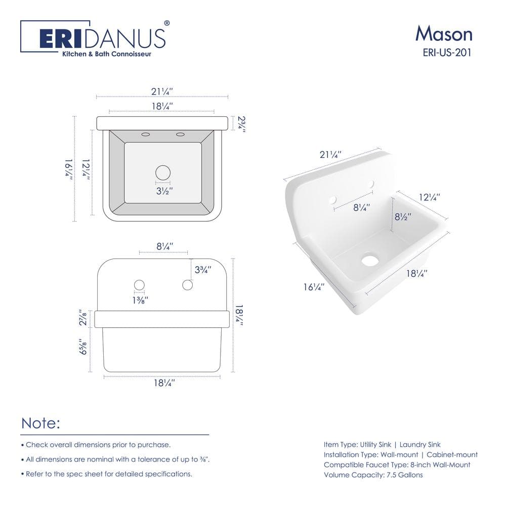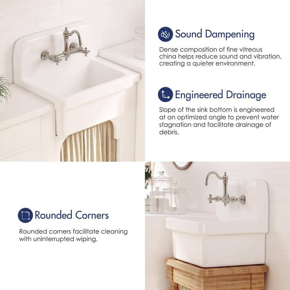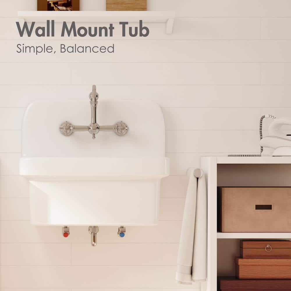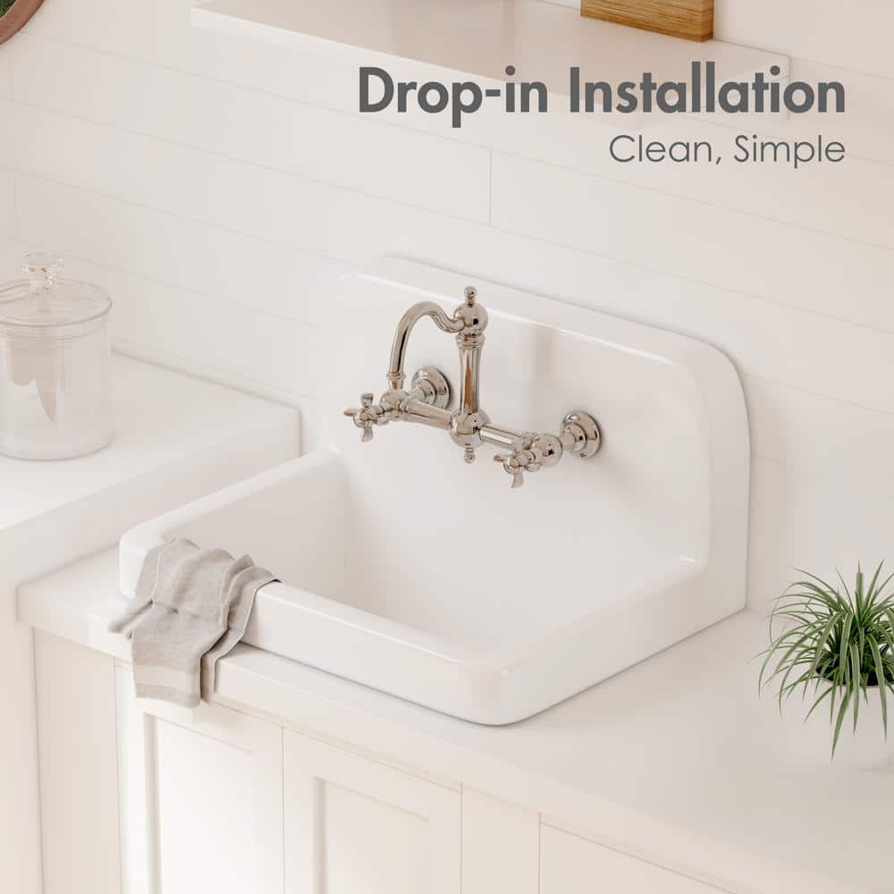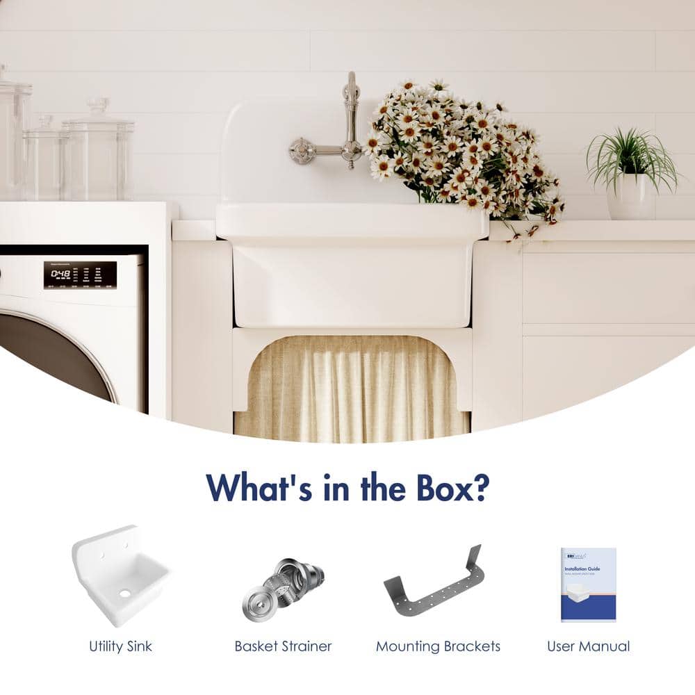 The Eridanus Mason 8 Gallon Wall Mount Utility Sink is designed for durability and versatility, made from high-quality ceramic that resists scratches and stains. With its classic farmhouse style and crisp white finish, this sink brings sophistication while providing a practical solution for any laundry or utility room setup. Easy to install with its sturdy wall mount, it's perfect for saving space and ensuring an effortless cleaning experience.