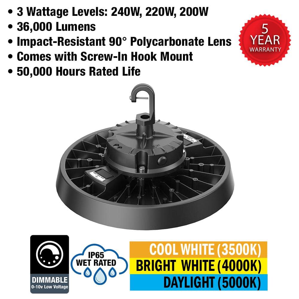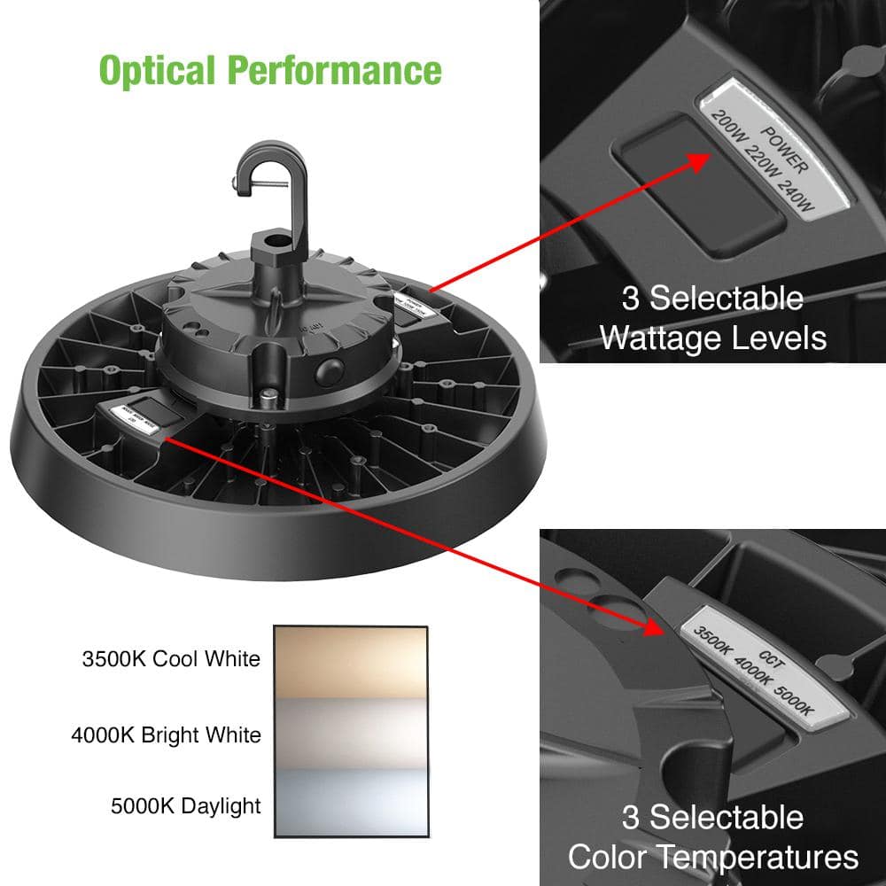 Flexibility: Adjustable wattage levels (200W/220W/240W) and color temperatures (3500K/4000K/5000K).