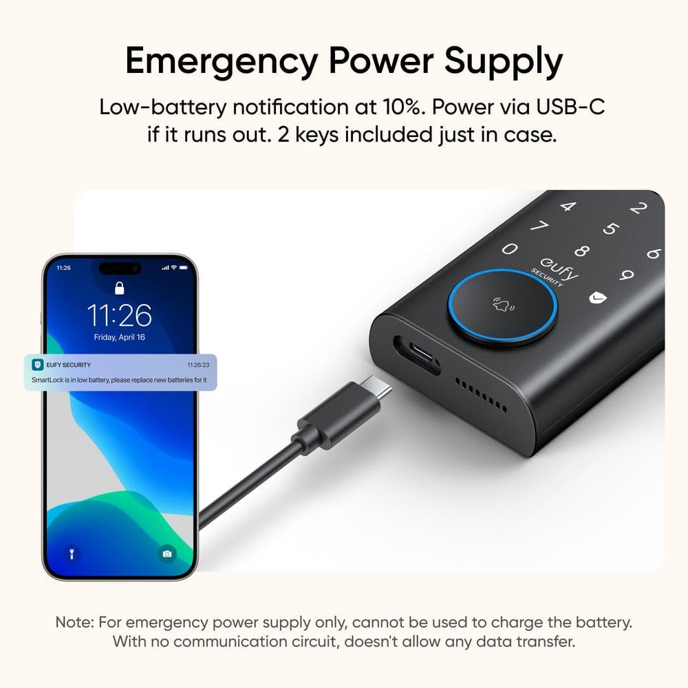 Q: What happens if the battery runs out? A: The lock features an emergency USB-C power supply port and a backup physical key, so you can always gain entry even if the battery is depleted.