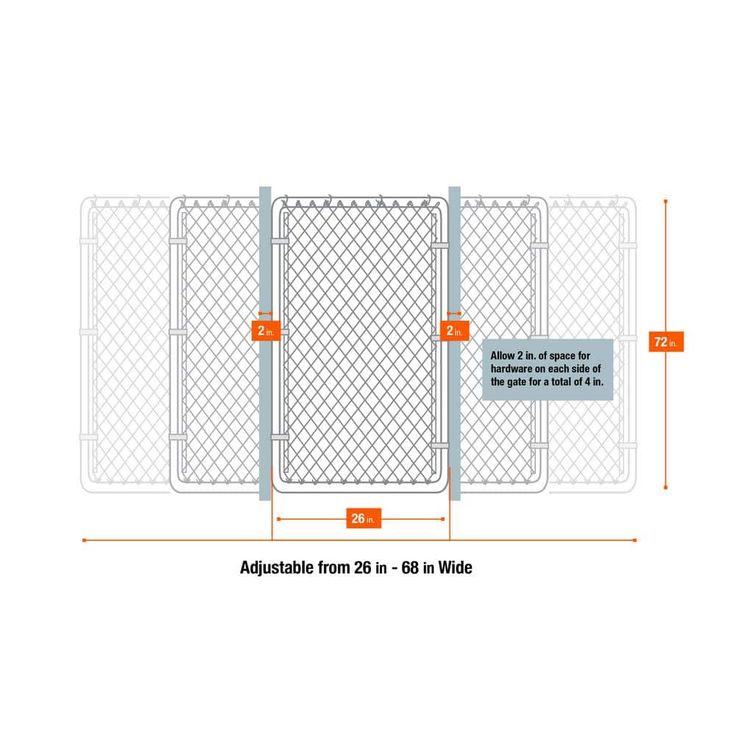 The Everbilt Expandable Chain Link Fence Gate Kit offers a versatile and durable solution for securing your property. Easily adjustable from 26 in. to 68 in. in width, this 6 ft. high gate is crafted from 12-gauge galvanized steel to withstand the elements and provide long-lasting functionality. Ideal for both residential and commercial use, it includes everything needed for fast assembly and installation.