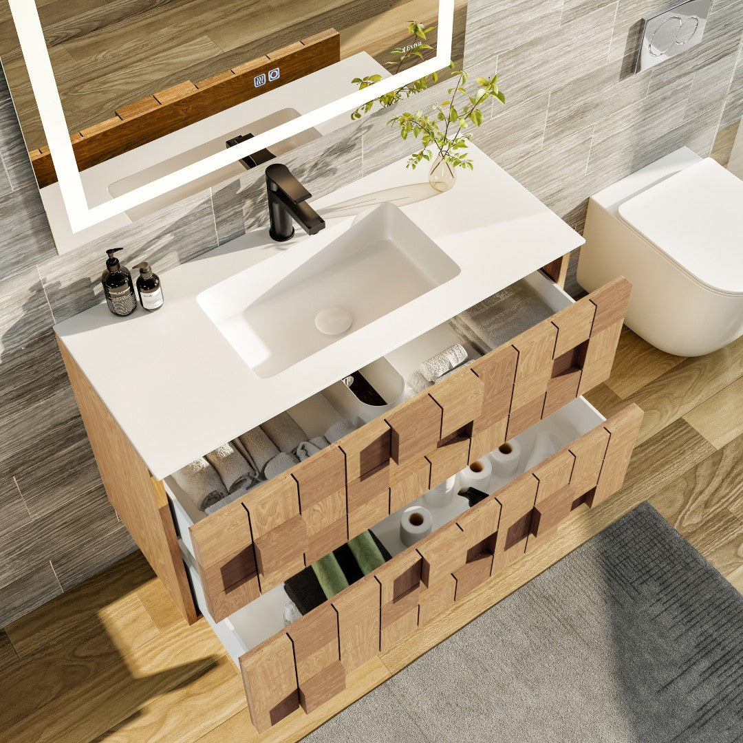 A striking wall-mounted vanity crafted from full solid American oak with a geometric block facade. It features a white, stain-resistant solid surface countertop with an integrated single-basin sink and arrives fully assembled for easy installation.