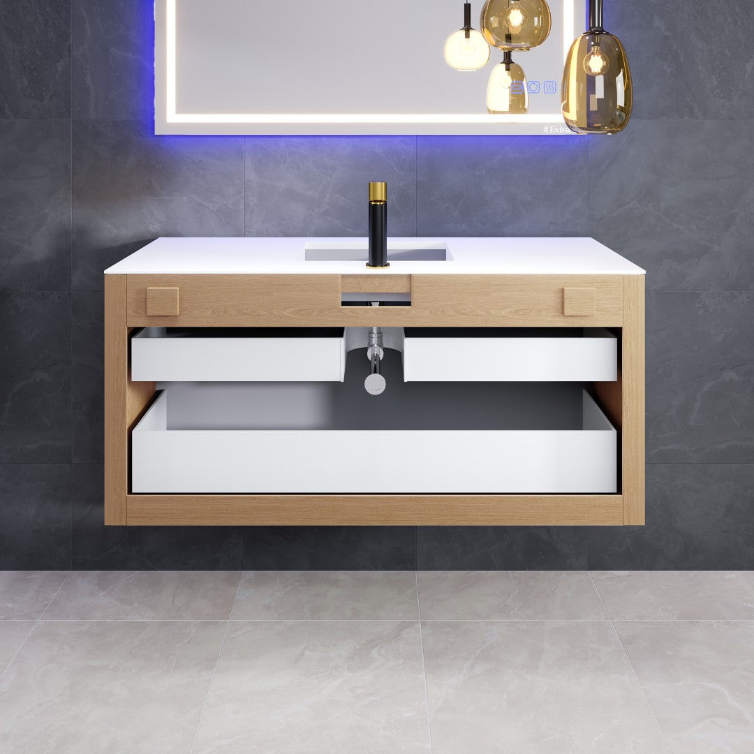 A statement wall-mounted vanity crafted from full solid American oak with a geometric block front. It features a white, stain-resistant solid surface countertop with an integrated single sink and two soft-closing, full-extension drawers for organized storage.