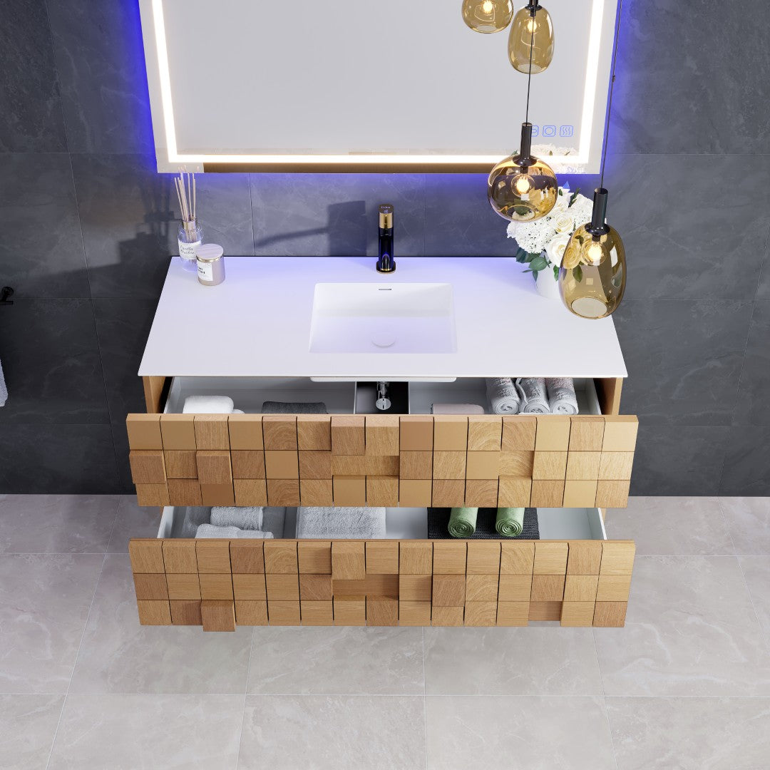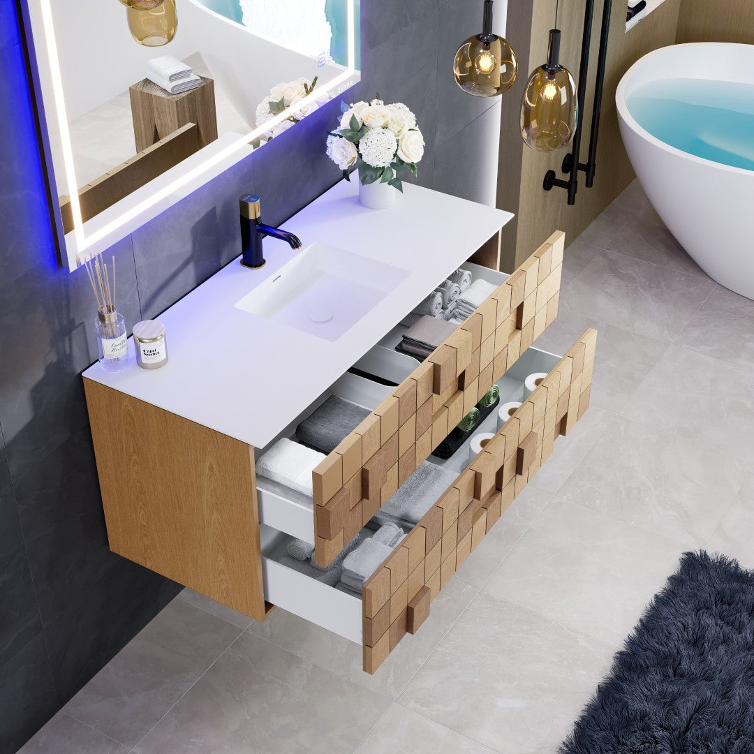 The Mosaic vanity is a captivating study in texture—the geometric oak blocks create a rhythmic façade that instantly elevates the bath. Its seamless white solid surface top and integrated sink deliver a crisp, gallery-like finish. Style it with matte black fixtures and warm pendant lighting to accentuate the floating silhouette. A refined essential for luxurious, contemporary living.
