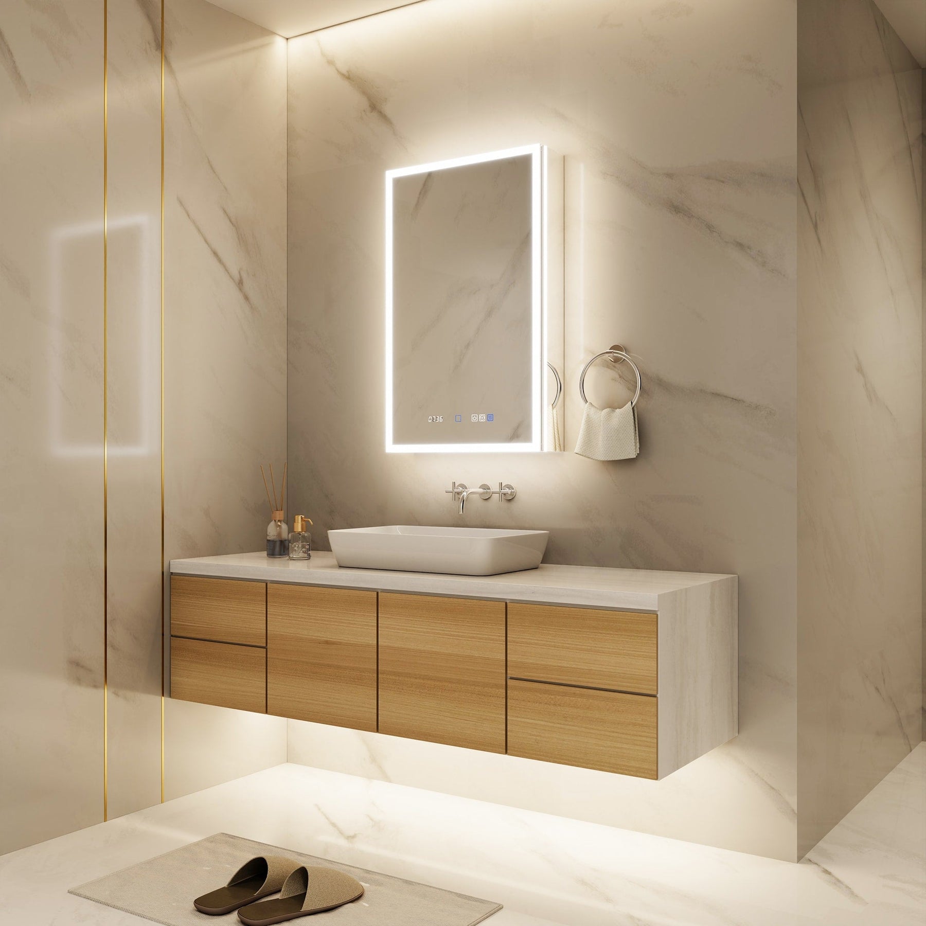 Transform the mundane into a sanctuary of sophistication with the ExBrite LED Medicine Cabinet. This sleek cabinet not only offers top-tier illumination but also dramatically enhances the spatial aesthetics of your bathroom. The frameless design and soft close features lend an air of quiet luxury. Style it alongside minimalist decor for a serene look, making this multifunctional cabinet an essential component of an exquisitely modern bath retreat.